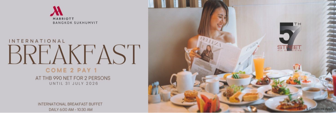 - Breakfast Voucher can be redeemed at 57th Street Restaurant at Bangkok Marriott Hotel Sukhumvit, daily from 6:00-10:30 hrs.