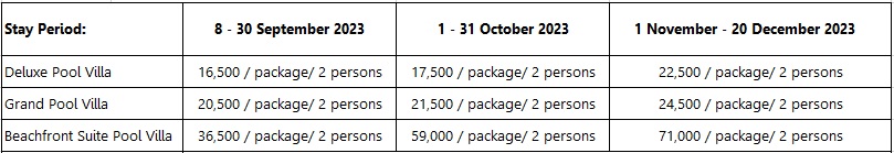 - Guarantee complimentary room upgrade from Deluxe Pool Villa to Grand Pool Villa for booking 8 - 30 September 2023.