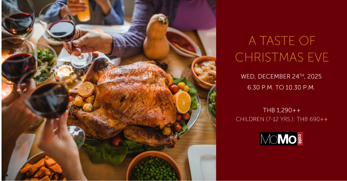 Celebrate the magic of Christmas Eve with a festive buffet featuring international and Thai holiday favorites — from premium carvings to decadent desserts. Enjoy smooth live saxophone tunes in a warm joyful atmosphere. Santa and Santarina will be there with special gifts for the little ones making it the perfect family celebration filled with festive cheer.