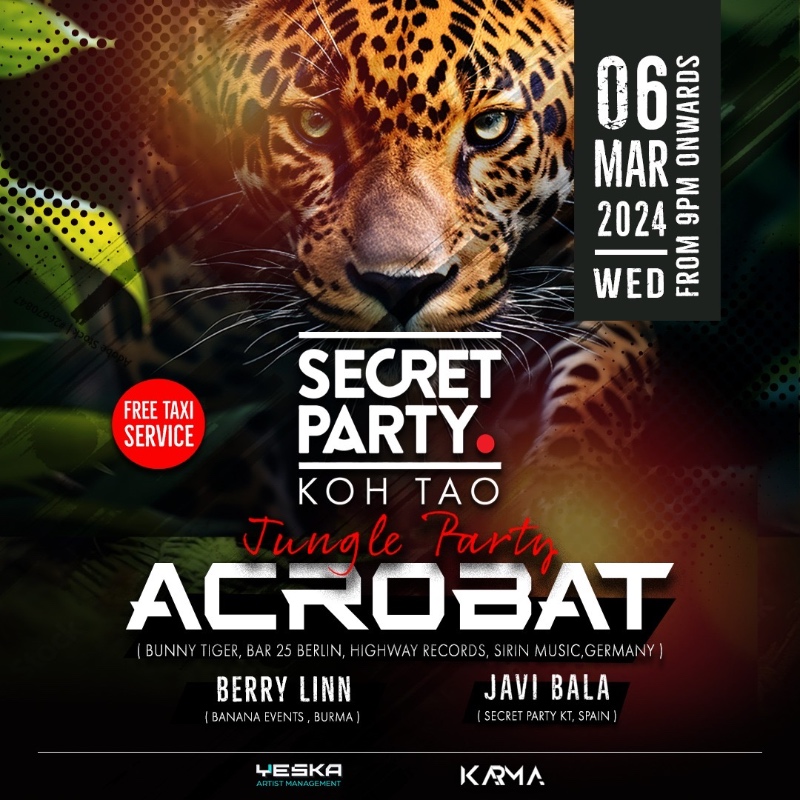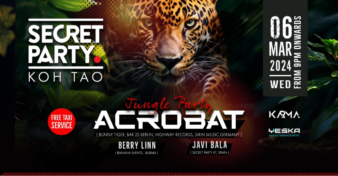 Acrobat headlines as a resident DJ of legendary, underground Koh Phangan islandโs parties Eden Garden, LightHouse, Guyโs Bar. Spinning in Asia in the most recent of years, especially in Koh Phan- ganโs music scene, has made him an artist in high demand. He is always involved in the Southeast Asia, Europe nightclub scene, traveling the world, touring top clubs, playing at numerous electronic festivals and countless dance events.