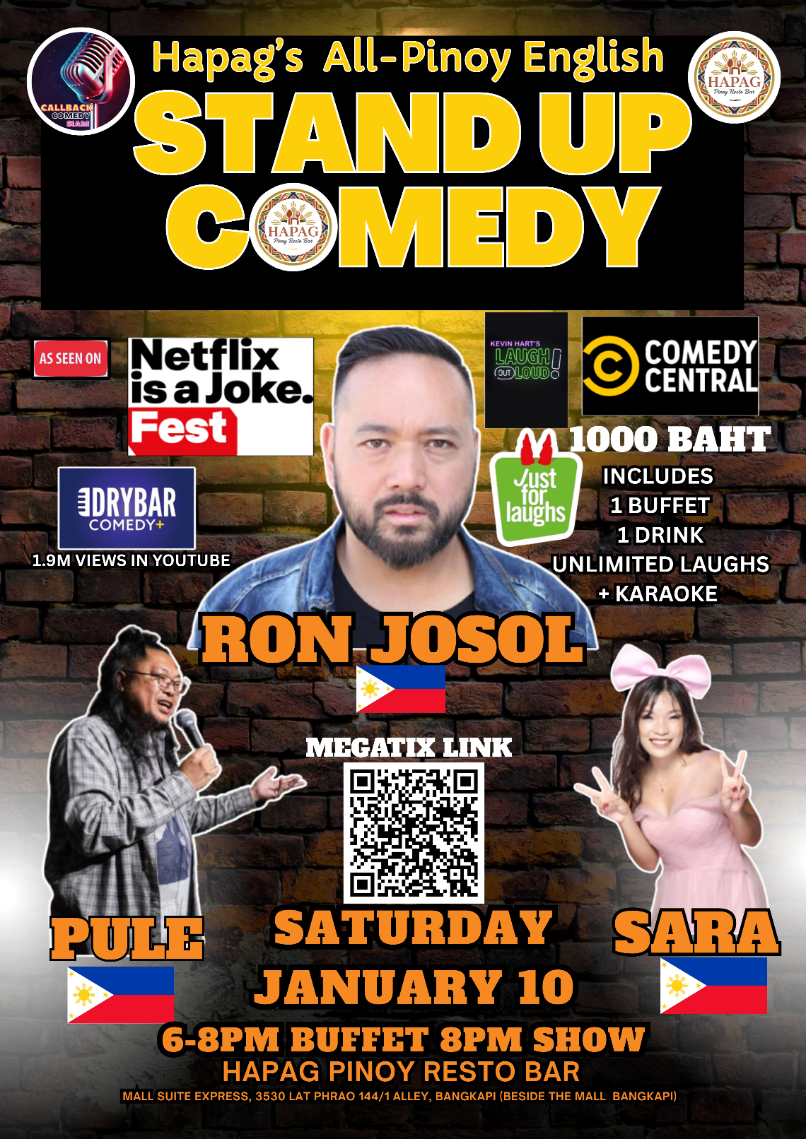 Filipino-Canadian comedy powerhouse Ron Josol comes to Hapag Pinoy Resto Bar to serve hot off the plate comedy alongside Bangkok-based Filipino international comedians Pule and Sara Yumi, Saturday, January 10, 2026 at Hapay Pinoy Restaurant, in Bangkapi.