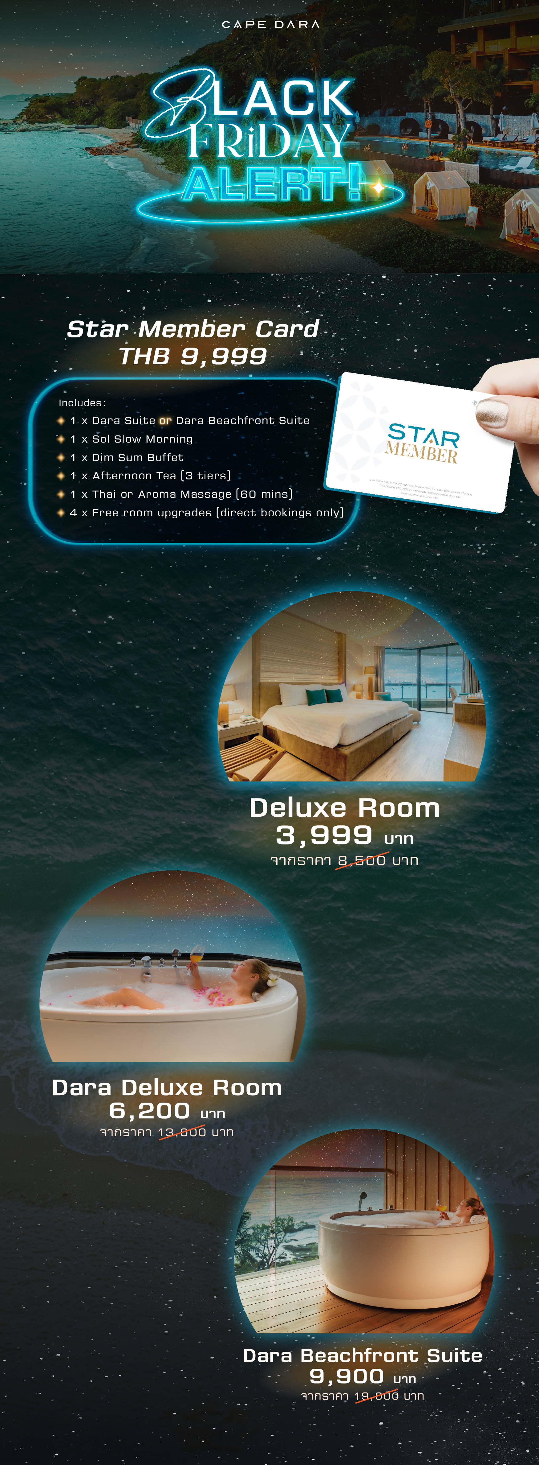 📣 สำหรับบัตร Cape Dara Star Member ตัวจริงสามารถรับได้ที่รีสอร์ทเท่านั้น