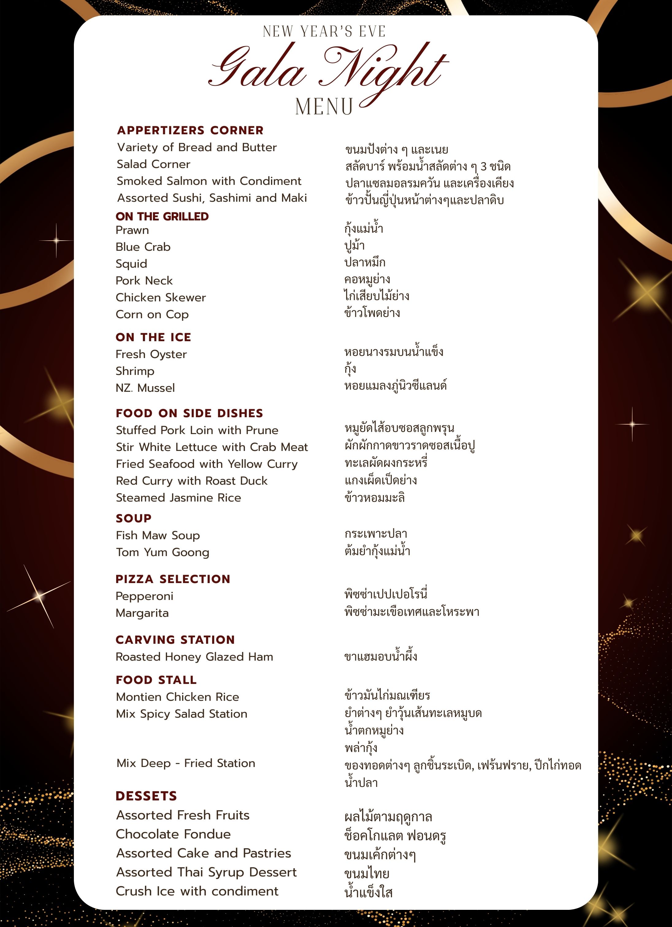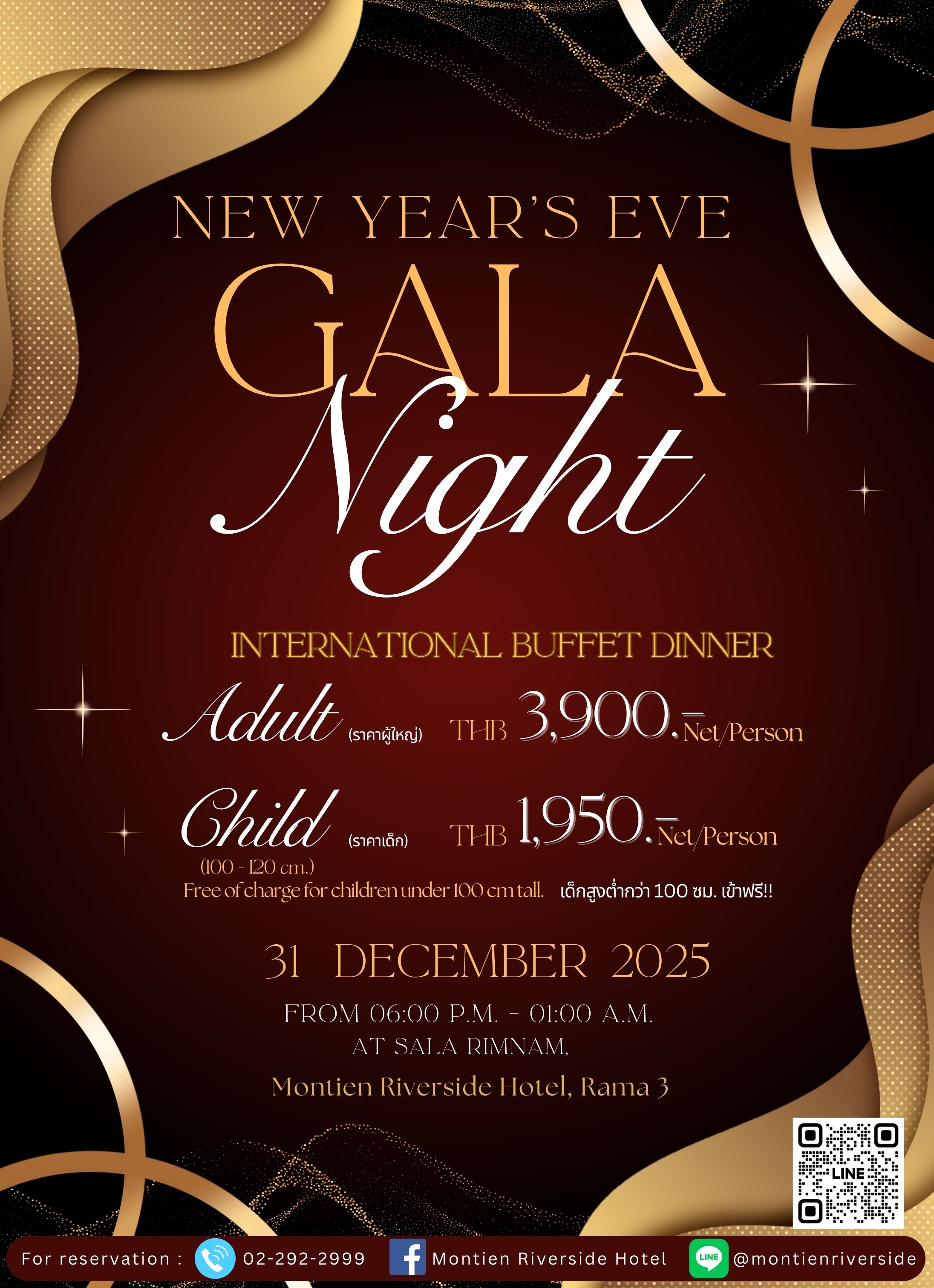 ที่งาน New Year’s Eve Gala Night เราจัดเต็มด้วยอาหารนานาชาติหลากหลายที่คัดสรรด้วยความตั้งใจ ในบรรยากาศริมแม่น้ำสุดอบอุ่น ที่เหมาะกับการฉลองร่วมกันทั้งครอบครัว ✨