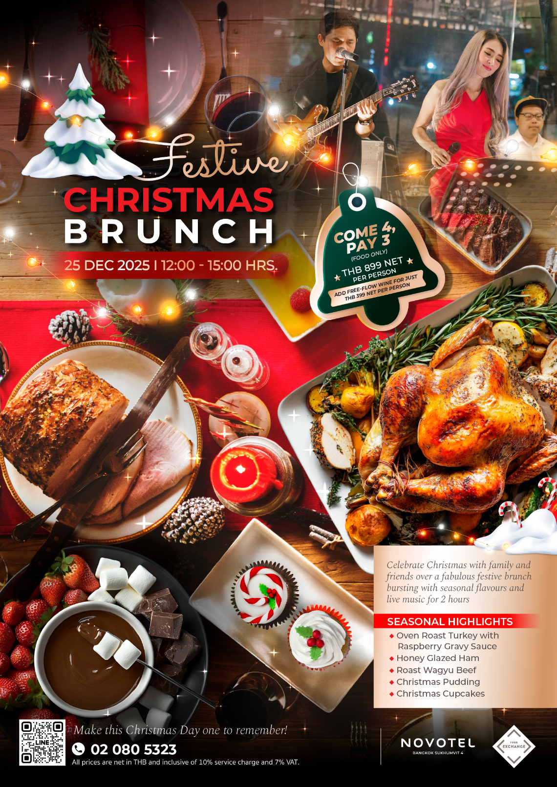 This December 25th, treat yourself and your loved ones to an unforgettable Christmas Brunch at Food Exchange, Novotel Bangkok Sukhumvit 4! Step into a festive wonderland filled with glittering décor, joyful cheer, and the irresistible aroma of a sumptuous holiday feast. 🍽️✨