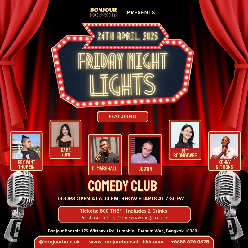 This April 24th, Bonjour Bonsoir transforms from your favorite daytime retreat into Bangkok’s most stylish Comedy Club. We’re bringing together a powerhouse lineup of local and international talent for a night of "Bonsoir" vibes, sharp wit, and premium drinks.