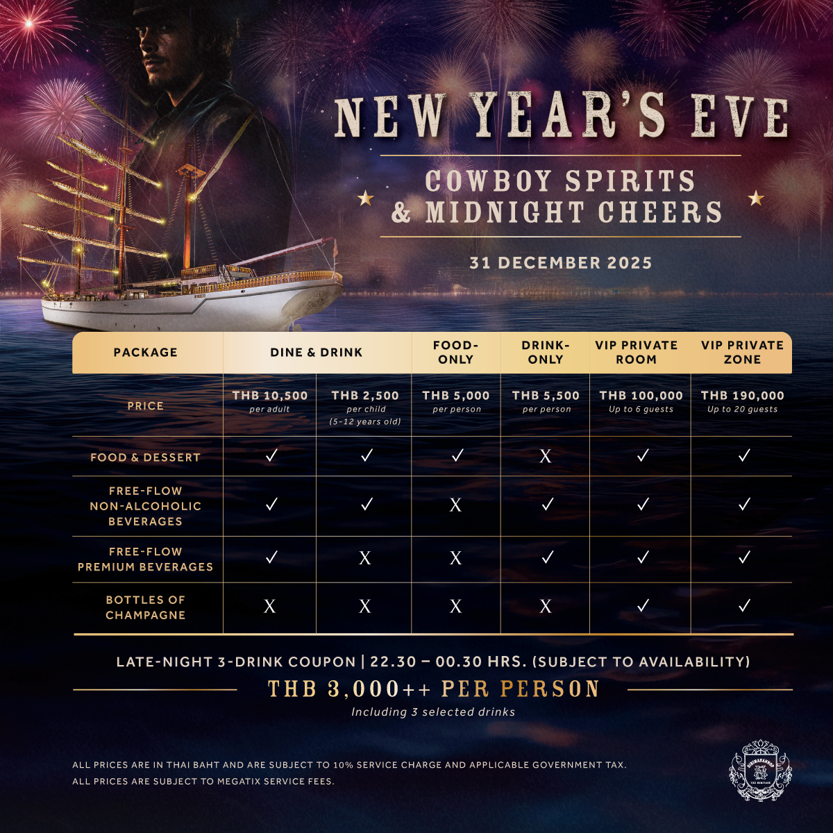 Step aboard Sirimahannop and saddle up for a night of bold flavors, vibrant beats, and cowboy energy. Discover live food stations, free-flow drinks, and uplifting entertainment, including a live band, DJ and dazzling midnight fireworks over the Chao Phraya River.