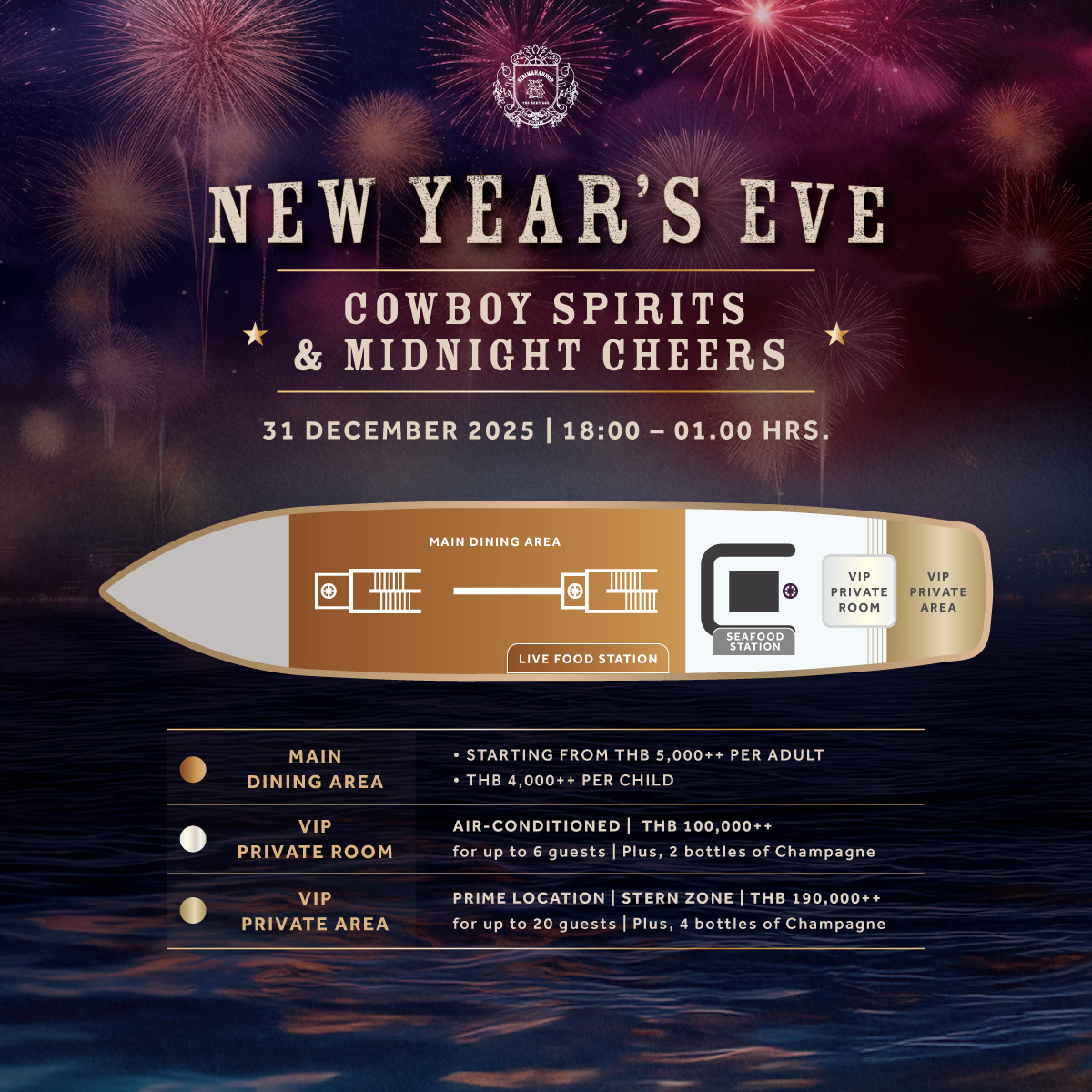 Step aboard Sirimahannop and saddle up for a night of bold flavors, vibrant beats, and cowboy energy. Discover live food stations, free-flow drinks, and uplifting entertainment, including a live band, DJ and dazzling midnight fireworks over the Chao Phraya River.