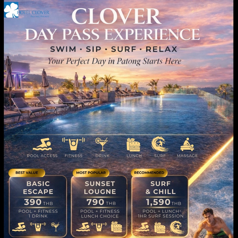 Enjoy the Clover Day Pass Experience at Hotel Clover Patong Phuket β swim, sip, surf, and relax all in one place.