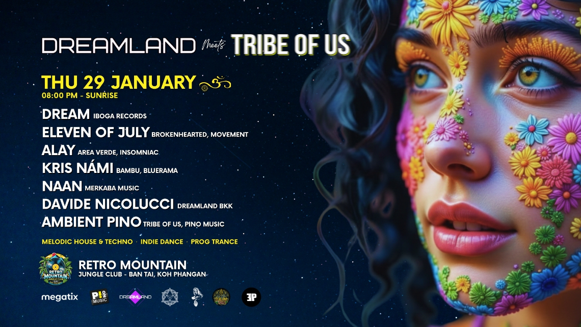 Get ready to dream with us again: Dreamland Events (Thailand) is bringing the hot vibes back to Koh Phangan in partnership with Tribe of Us (Switzerland). Come dance all night with us until sunrise at the rythm of the best Melodic Techno & House, Indie Dance, Prog Trance.