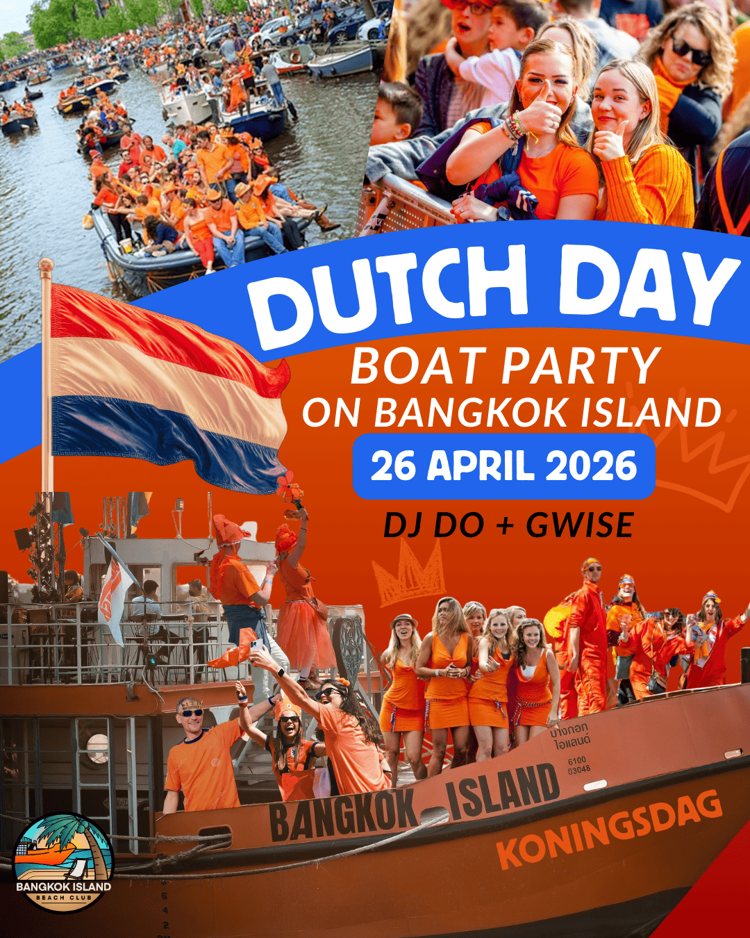 นี่ไม่ใช่แค่ Koningsdag — แต่นี่คือ 300 คนเปลี่ยนเรือให้กลายเป็นความเดือดแบบดัตช์กลางกรุงเทพ มีที่เดียวที่เป็นไปได้ Bangkok Island 🧡