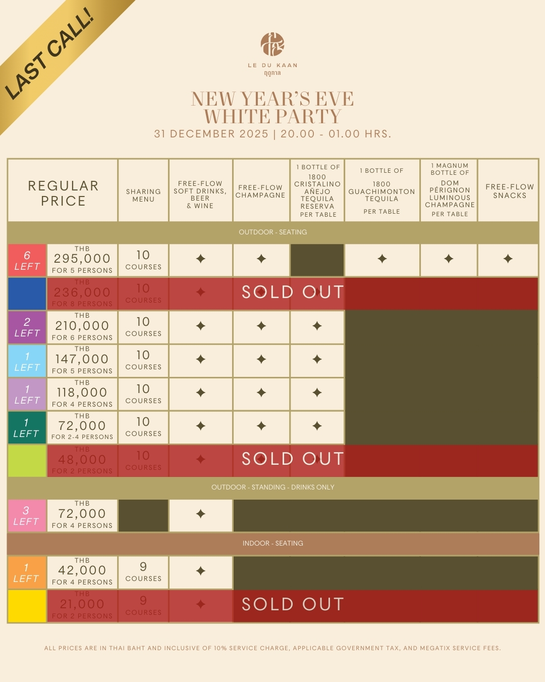 Celebrate New Year’s Eve in style at Le Du Kaan’s “The White Horizon”, an all-white party high above Bangkok. Delight in modern Thai cuisine, free-flow premium drinks, live music and DJs, and captivating dance performances. Surrounded by glowing white décor and lotus blooms, enjoy the city’s most spectacular fireworks and welcome 2026 with elegance, energy, and a glittering skyline.