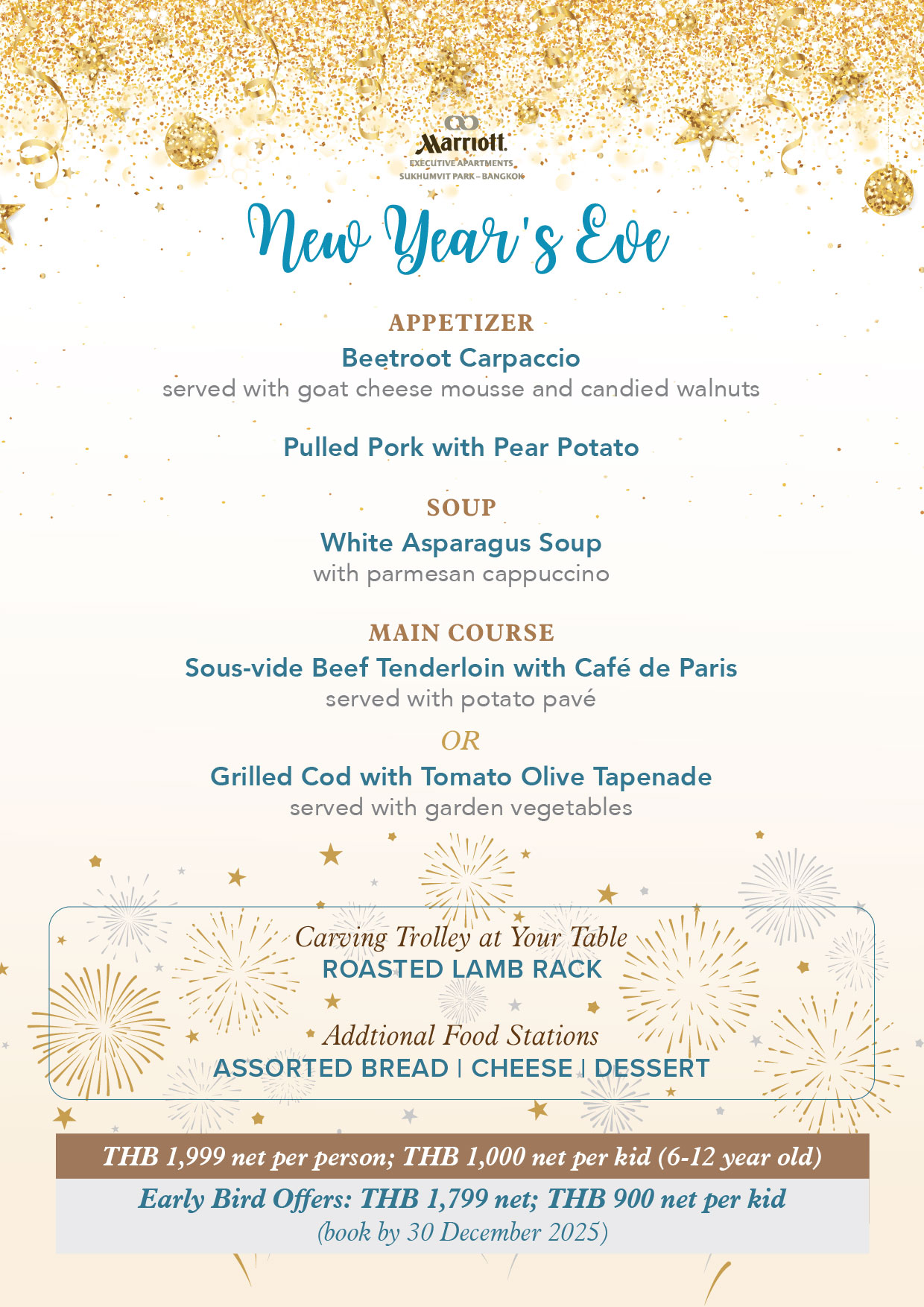 âĒ   The Early Bird New Year's Eve Dinner @ Garden Lounge and New Year's Eve Dinner @ Garden Lounge are valid on December 31, 2025, from 6:00 PM to midnight at the Garden Lounge, Marriott Executive Apartments Sukhumvit Park, Bangkok.