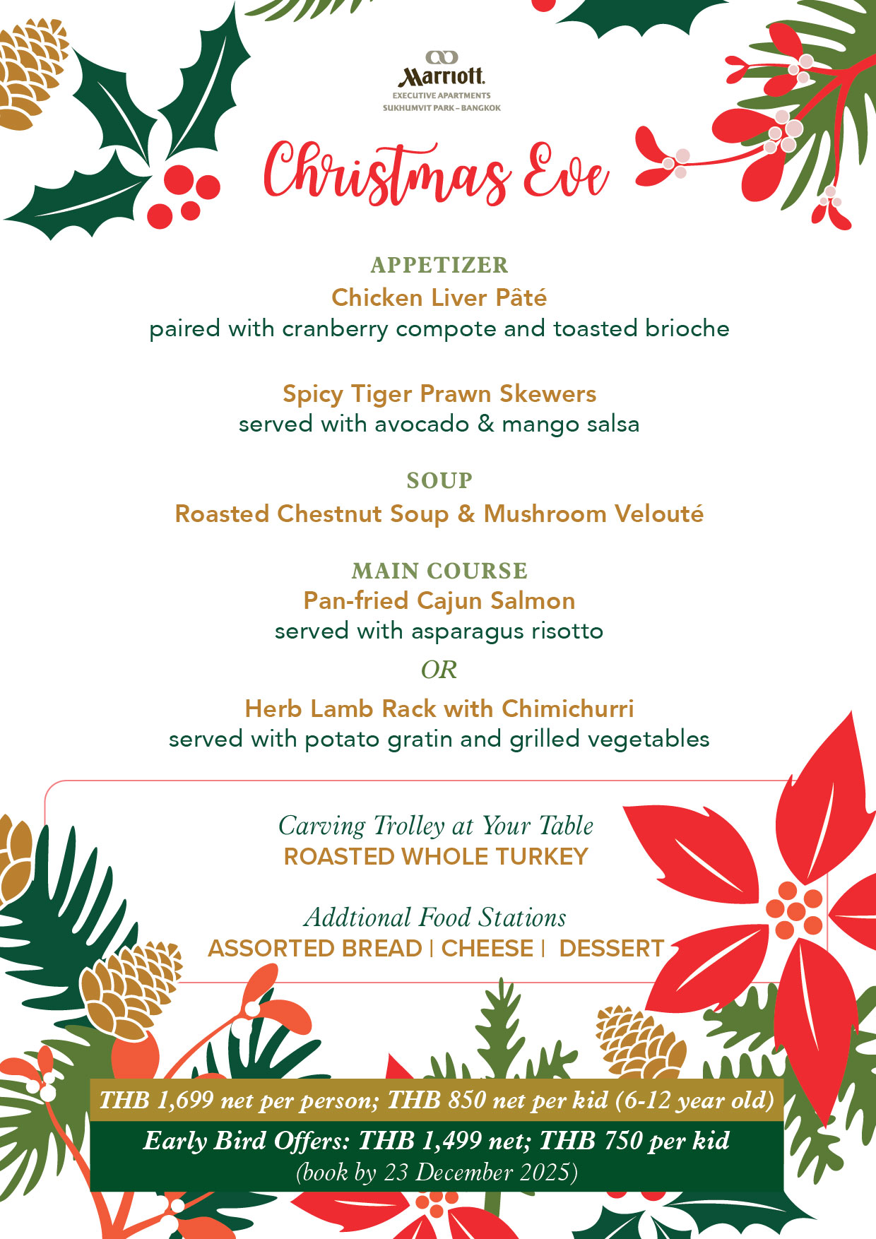 âĒ   The Early Bird Christmas Eve Dinner @ Bar on 3 and Christmas Eve Dinner @ Bar on 3 are valid on December 24, 2025, from 6:00 PM to 10:00 PM at Bar on 3, Marriott Executive Apartments Sukhumvit Park, Bangkok.
