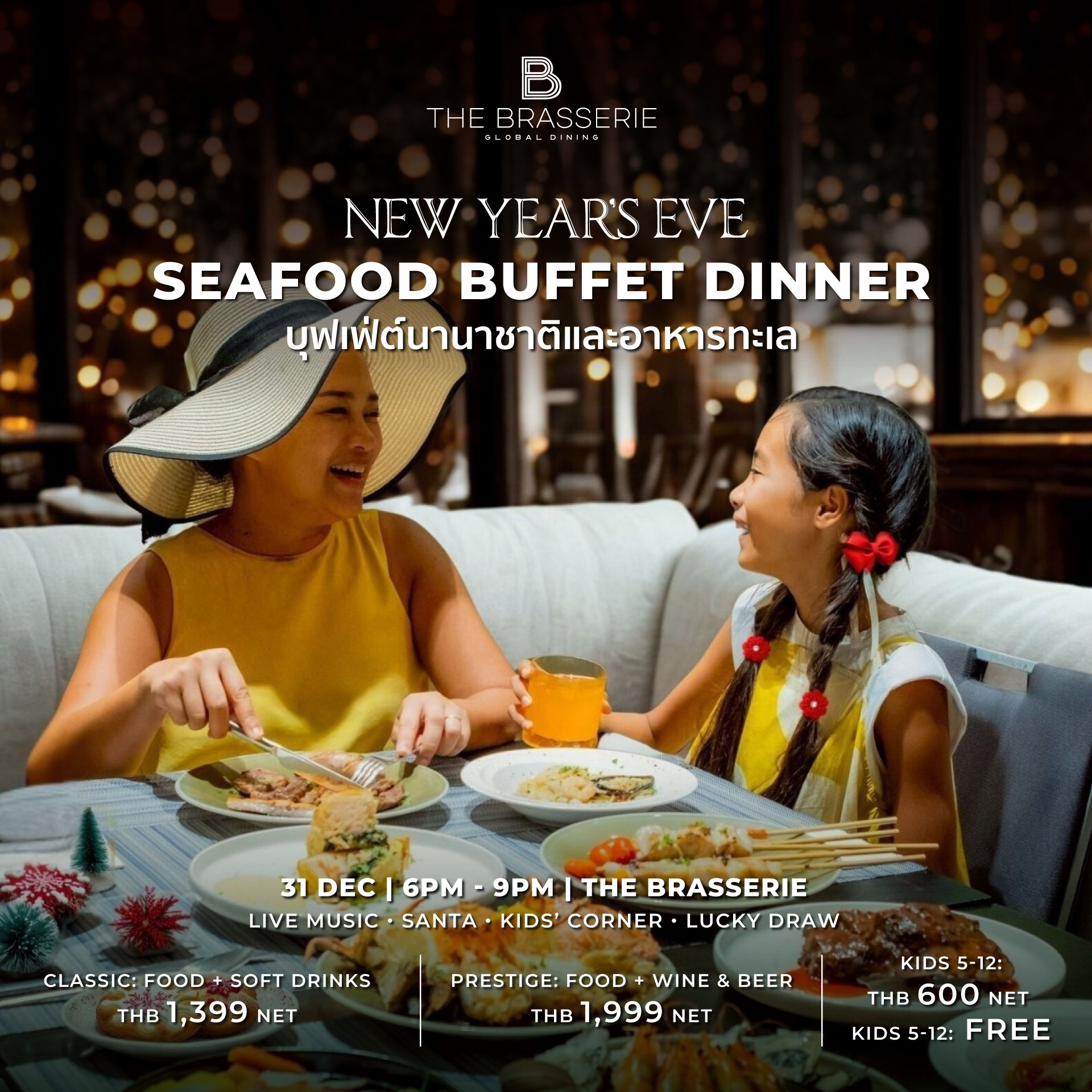 ฉลองคริสต์มาสอีฟ อิ่มอร่อยกับซีฟู้ดสดและบาร์บีคิว เมนูไฮไลท์ อาทิ แซลมอนเวลลิงตัน ไก่งวงอบสมุนไพร อาหารไทย เวสเทิร์น ญี่ปุ่น และของหวานหลากหลาย เพลิดเพลินกับดนตรีสด มุมสำหรับเด็ก และลุ้นรับของรางวัล