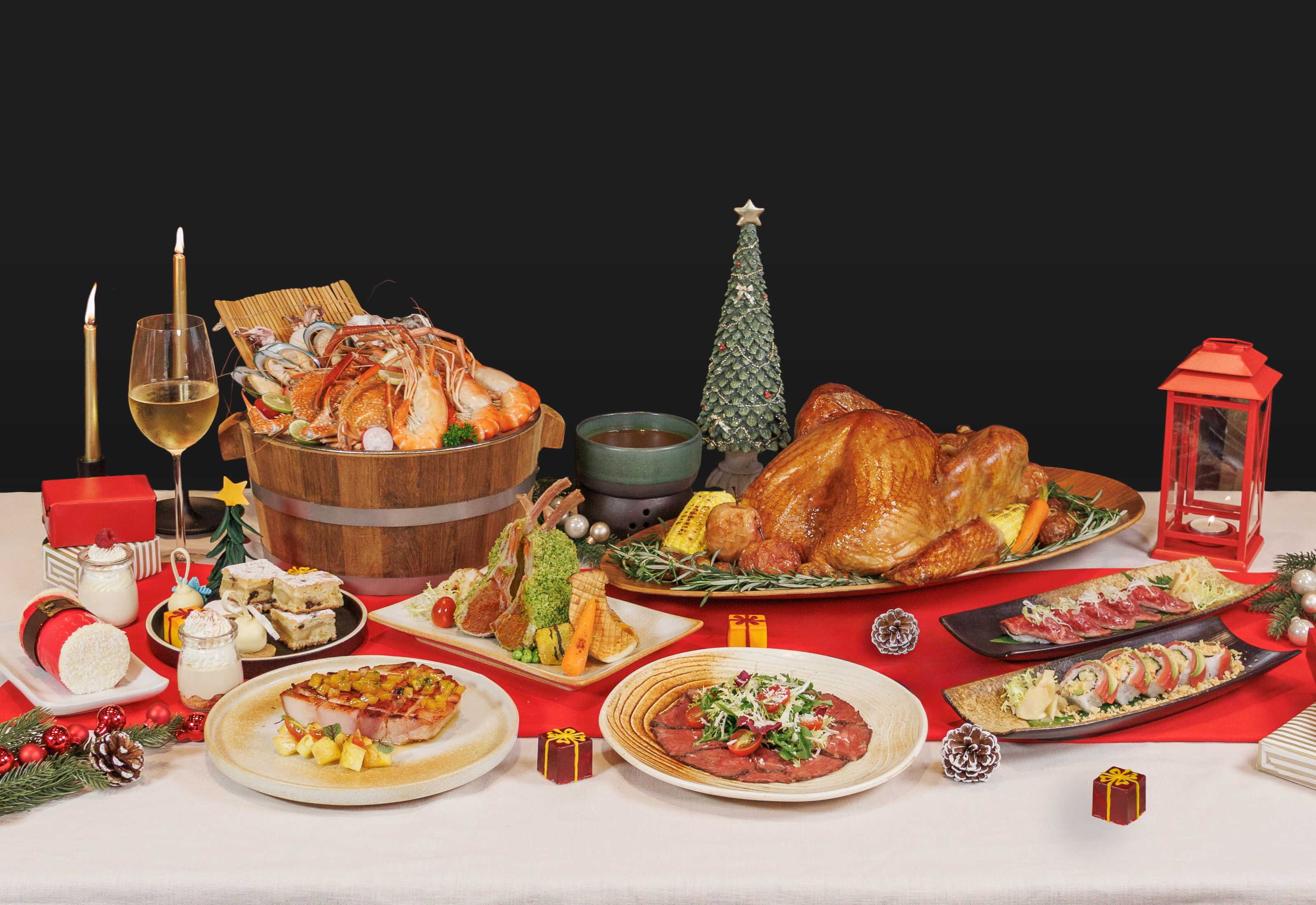 Join us for a festive Christmas celebration at The Brasserie, where an exceptional dining experience awaits. Indulge in a traditional Christmas buffet featuring Roasted Turkey with Stuffing, Honey-Glazed Gammon Ham, Teppanyaki Salmon Fillet with Miso Glaze, Duck Breast with Five Spice Marinade, Wagyu Beef Cubes with Garlic Soy Butter, Herb-Crusted Lamb Chops, Slow-Braised Beef Cheek Stew, and an array of holiday desserts including Christmas Log Cake, Gingerbread Cheesecake, Eggnog Panna Cotta, Mulled Wine Poached Pears, and Stollen Bites.