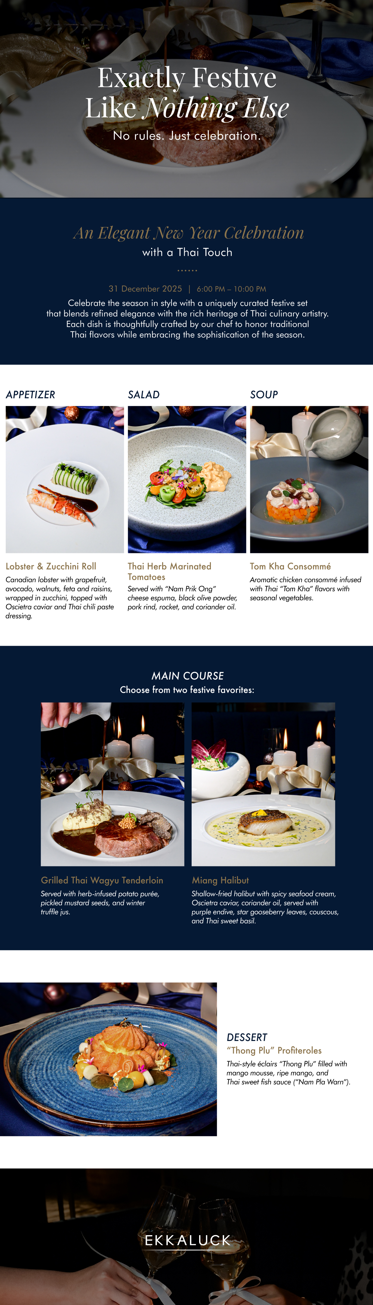 ต้อนรับปีใหม่อย่างมีสไตล์ กับค่ำคืนแห่งรสชาติและความสุขสุดพิเศษ เชิญคุณและคนพิเศษมาร่วมเฉลิมฉลองด้วยเมนูสุดประณีตและช่วงเวลาที่น่าจดจำ ให้ค่ำคืนส่งท้ายปีนี้พิเศษยิ่งขึ้น