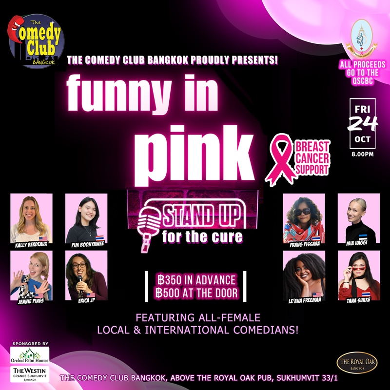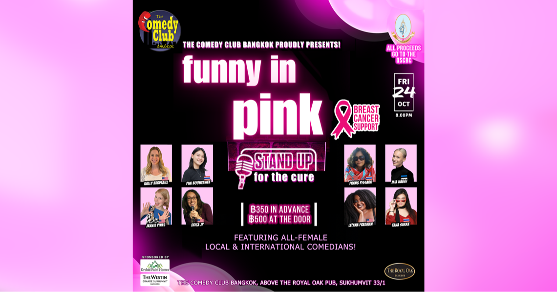 In support of Breast Cancer Awareness Month and The Queen Sirikit Center for Breast Cancer (QSCBC) Foundation, we are raising funds for breast cancer research and awareness initiatives. Expect a hilarious evening full of witty humour, powerful performances, a little bit of music and improv, and an empowering atmosphere as we come together to fight breast cancer.