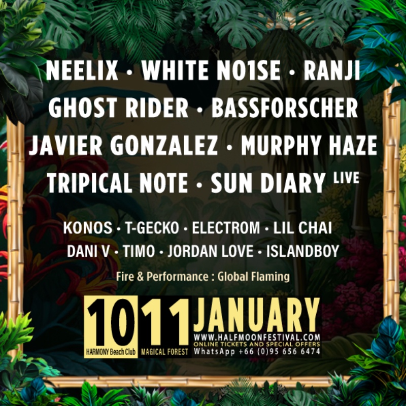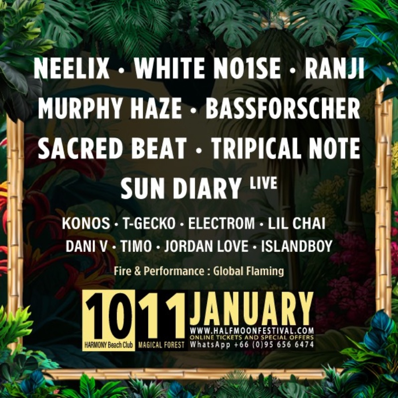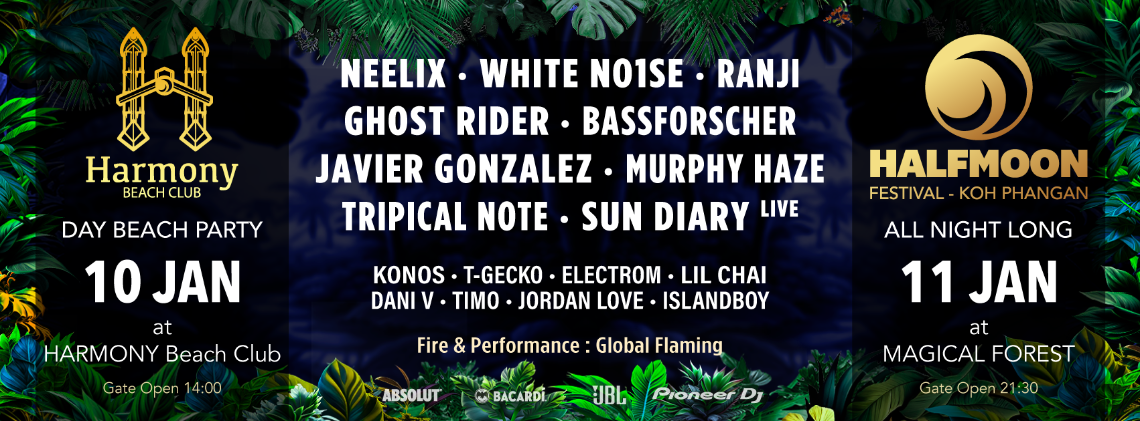 Halfmoon Festival returns for a two-day celebration of music, human connection, and the true island spirit. Experience both sides of Koh Phangan — A day to night beachfront celebration at Harmony Beach Club and the legendary all-night open air festival deep within the Magic Forest.
