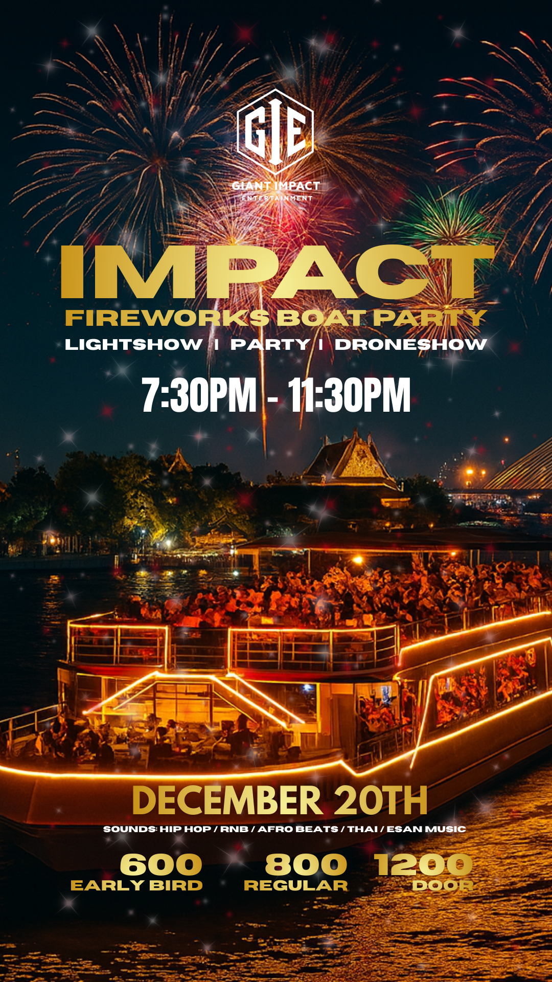 Our DJs will bring the heat with a vibrant mix of Hip-Hop, R&B, Afrobeats, Thai, and Isaan music, creating the perfect soundtrack for an epic night on the water.
