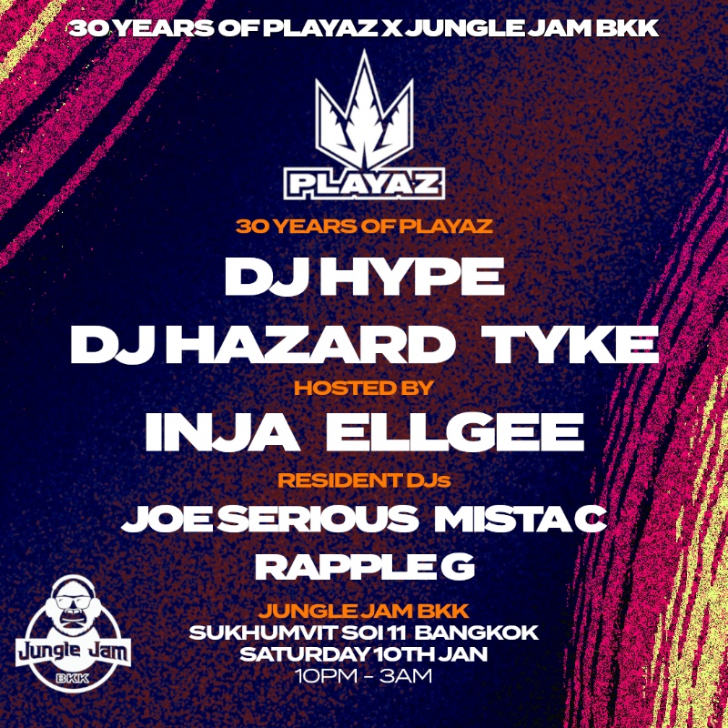 Leading us in, the legendary DJ HYPE, a godfather in Drum and Bass whose influence with True Playaz spans three decades of groundbreaking work, time-less sets, esteemed productions and not to forget insane ‘scratching’. Joining him, the one and only DJ HAZARD, another Playaz heavyweight known for his heavy-duty style, tune selecta’s and nothing less than dancefloor carnage that has made him one of the most respected names in the DnB world. DJ TYKE brings his signature tunes, style and technical precision to the decks, hot off the back of his fresh, top-drawer releases with Prestige on Playaz, while MC INJA will host the mic with his iconic vocal style and dynamic stage presence that has made him a modern DnB legend. The night will also be co-hosted by our rising star MC Ell Gee, whose dedication in the scene is now getting noticed by big names in the scene. Supporting these international legends, the Jungle Jam crew will be holding it down with the passion and energy that has made Bangkok an iconic Drum and Bass destination.