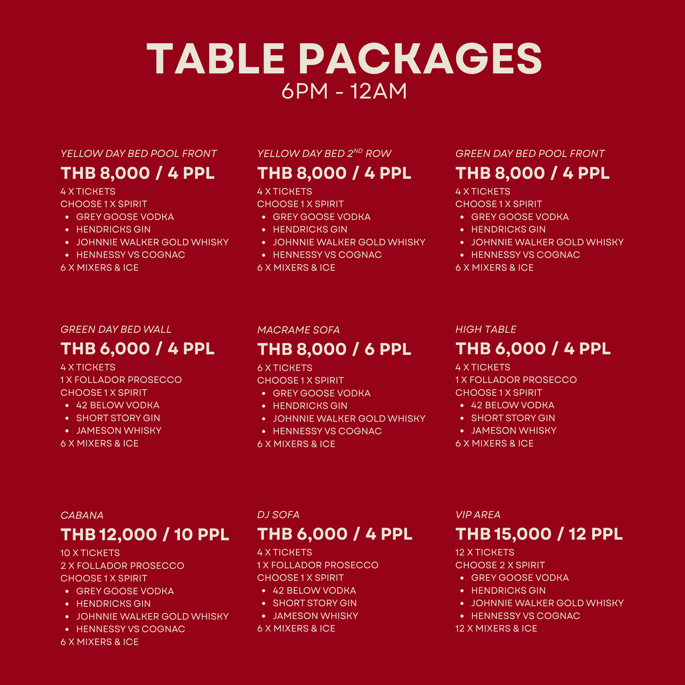 • Wristbands lost will not be replaced, table would have to purchase new wristbands per person at door ticket price; THB 1,000