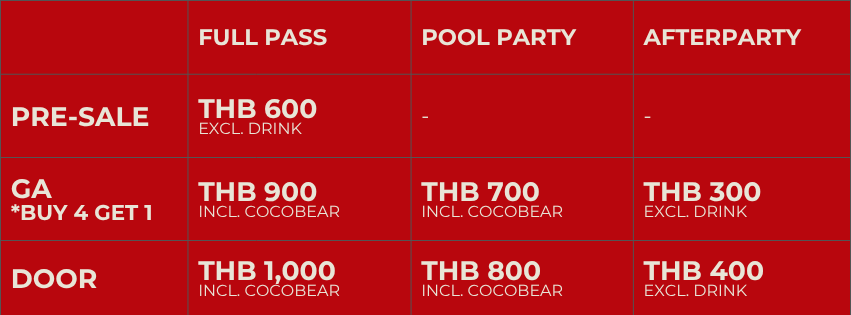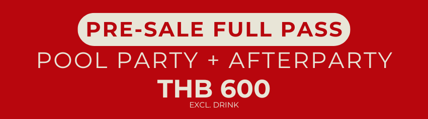• Wristbands lost will not be replaced, table would have to purchase new wristbands per person at door ticket price; THB 1,000 Full Pass, THB 800 Pool Pass, THB 400 AfterParty Pass