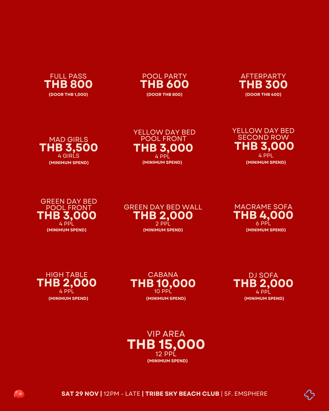 - EXTRA TABLE WRISTBANDS CAN BE PURCHASED AT THB DOOR TICKET PRICE. THB 1,000 FULL PASS, THB 800 POOL PASS, THB 400 AFTERPARTY PASS - NET PER PERSON. UP TO A MAXIMUM OF 2 EXTRA WRISTBANDS PER TABLE.