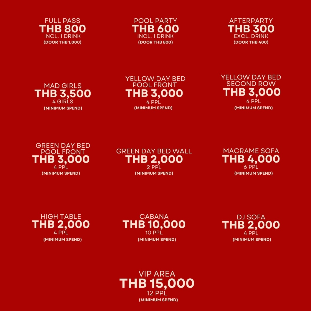 - EXTRA TABLE WRISTBANDS CAN BE PURCHASED AT THB DOOR TICKET PRICE. THB 1,000 FULL PASS, THB 800 POOL PASS, THB 400 AFTERPARTY PASS - NET PER PERSON. UP TO A MAXIMUM OF 2 EXTRA WRISTBANDS PER TABLE.