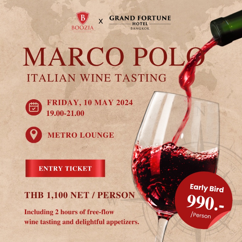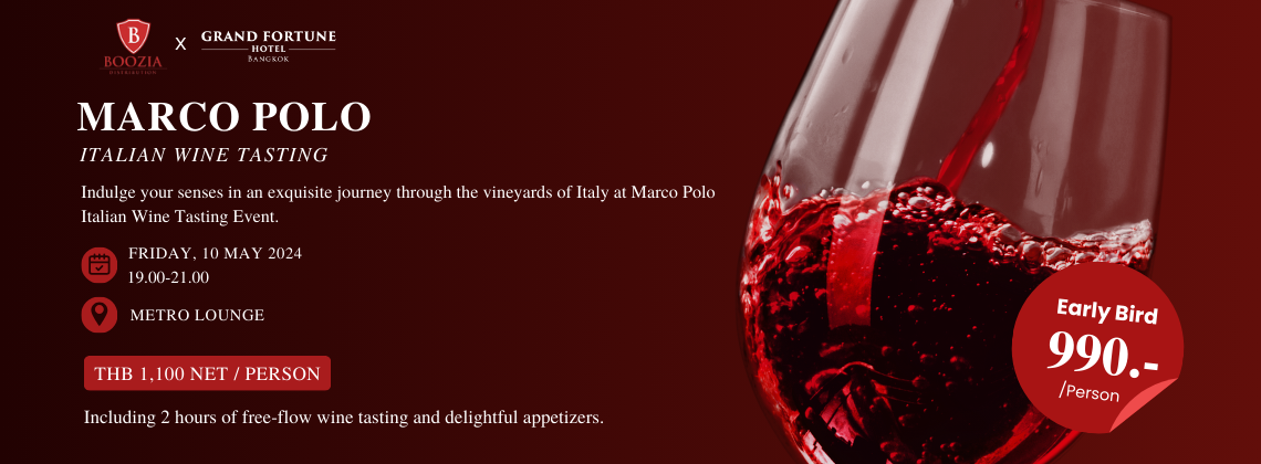 The Grand Fortune Hotel Bangkok is thrilled to present an evening of elegance and indulgence at the Marco Polo Italian Wine Tasting event. This exclusive gathering will take place on the enchanting evening of May 10th, 2024.