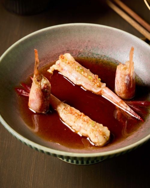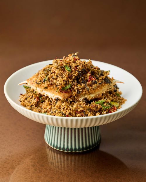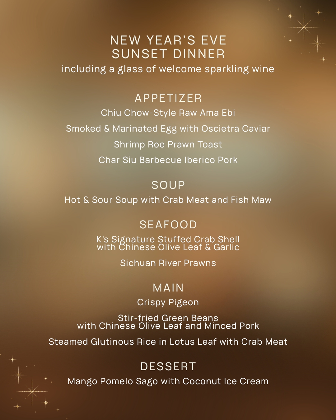 Savor premium delicacies from land and sea, including Char Siu Barbecue Iberico Pork, K’s Signature Stuffed Crab Shell with Chinese Olive Leaf & Garlic, Sichuan River Prawns, and Crispy Pigeon — ending on a sweet tropical note with Mango Pomelo Sago and Coconut Ice Cream.