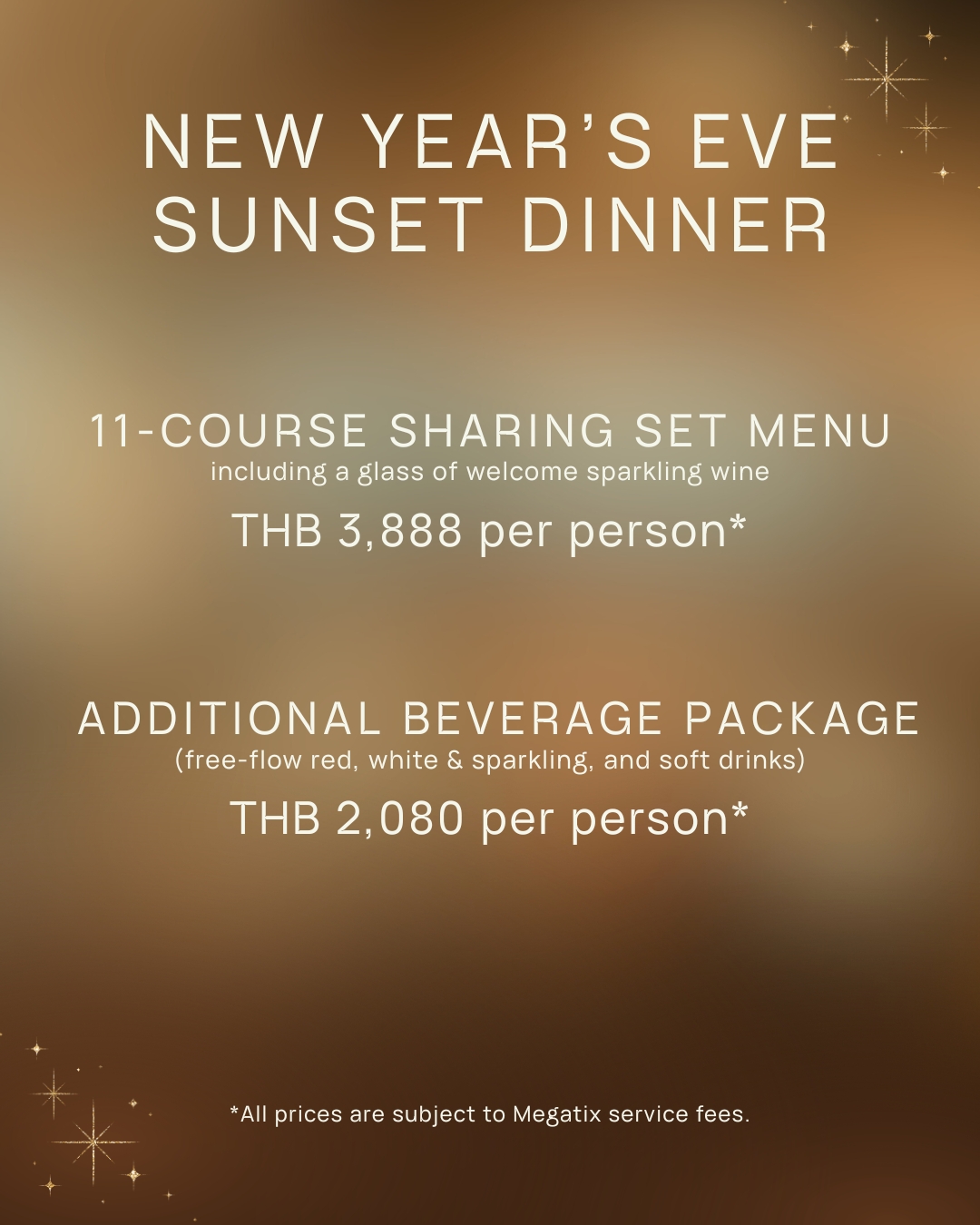 • Eleven-course sharing set menu with beverage package: THB 5,968 net per person (free-flow red, white & sparkling wines, and soft drinks)