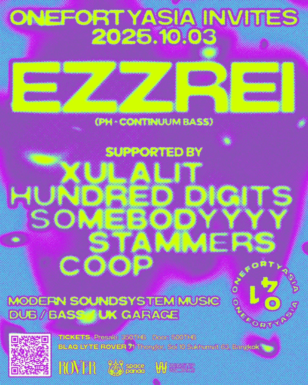 A night of 140 BPM heat at Bangkok! Brace yourself for seismic waves of DUB, BASS, and UK GARAGE, as Ezzrei from Continuum Bass takes the decks alongside an unstoppable international lineup. This is a global bass assault! The soundwaves hit at ROVER from 21:00 on October 3rd - don't be late.