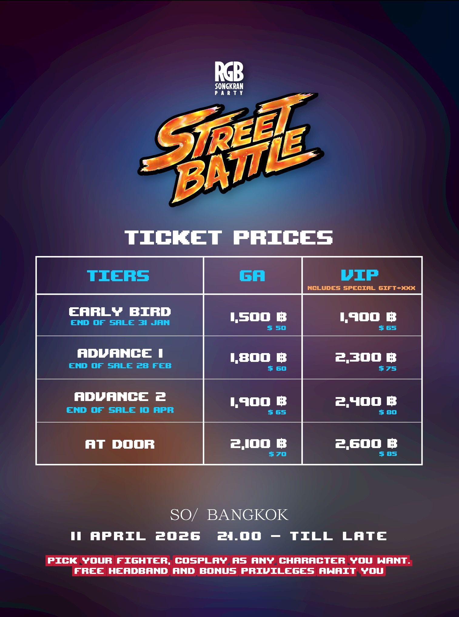Step into a Songkran experience unlike any other at RGB Songkran Party 2026 "Street Battle". Inspired by the iconic Street Fighter era, this event brings street culture, power, and style together.