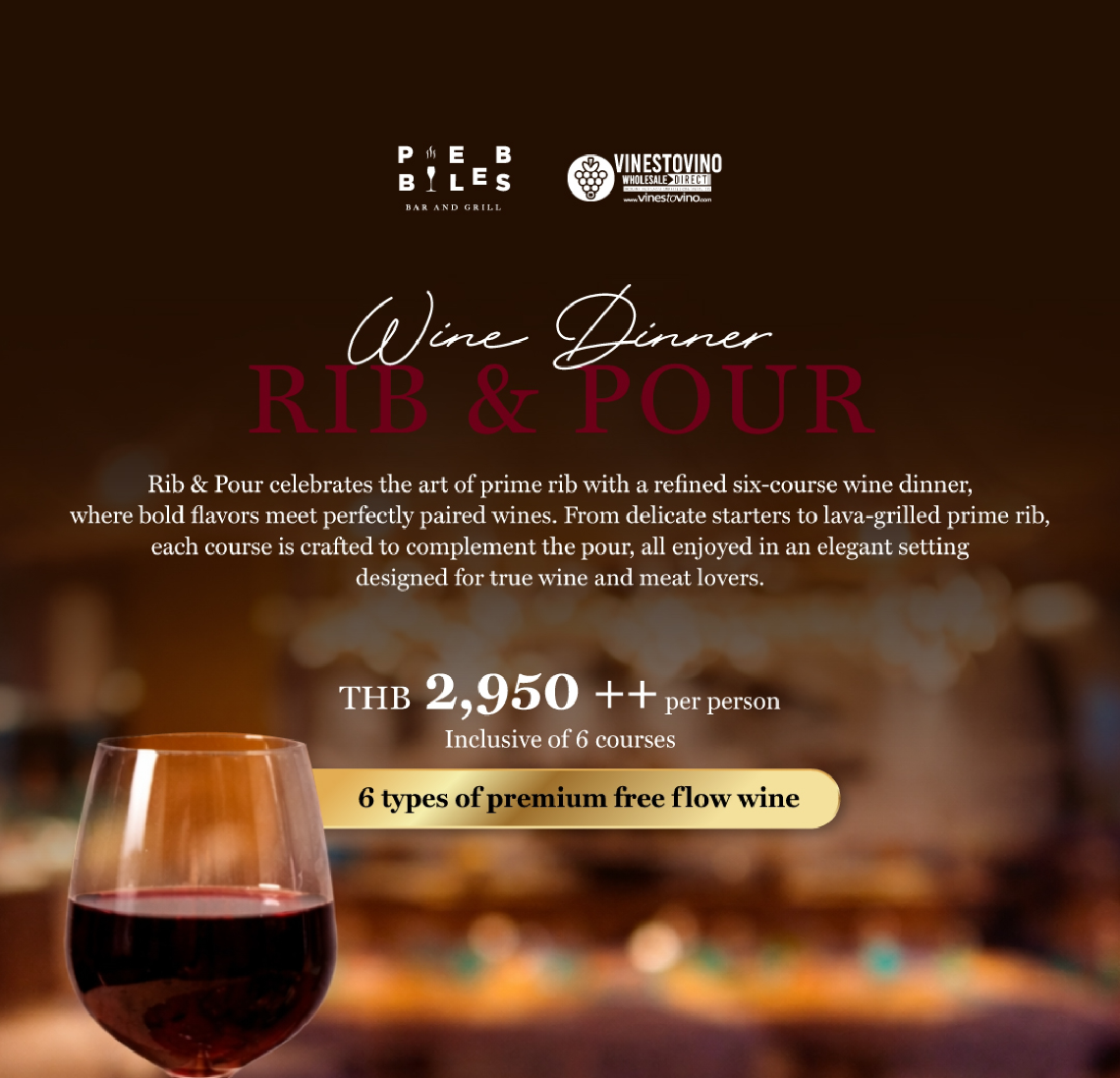 Join us at Pebbles Bar & Grill for an indulgent six-course wine dinner crafted for true wine and meat lovers. From delicate seafood starters to the show-stopping lava-grilled prime rib, each course is thoughtfully paired with premium wines from Italy and Portugal — ending on a sweet note with Tawny Port and Basque cheesecake.