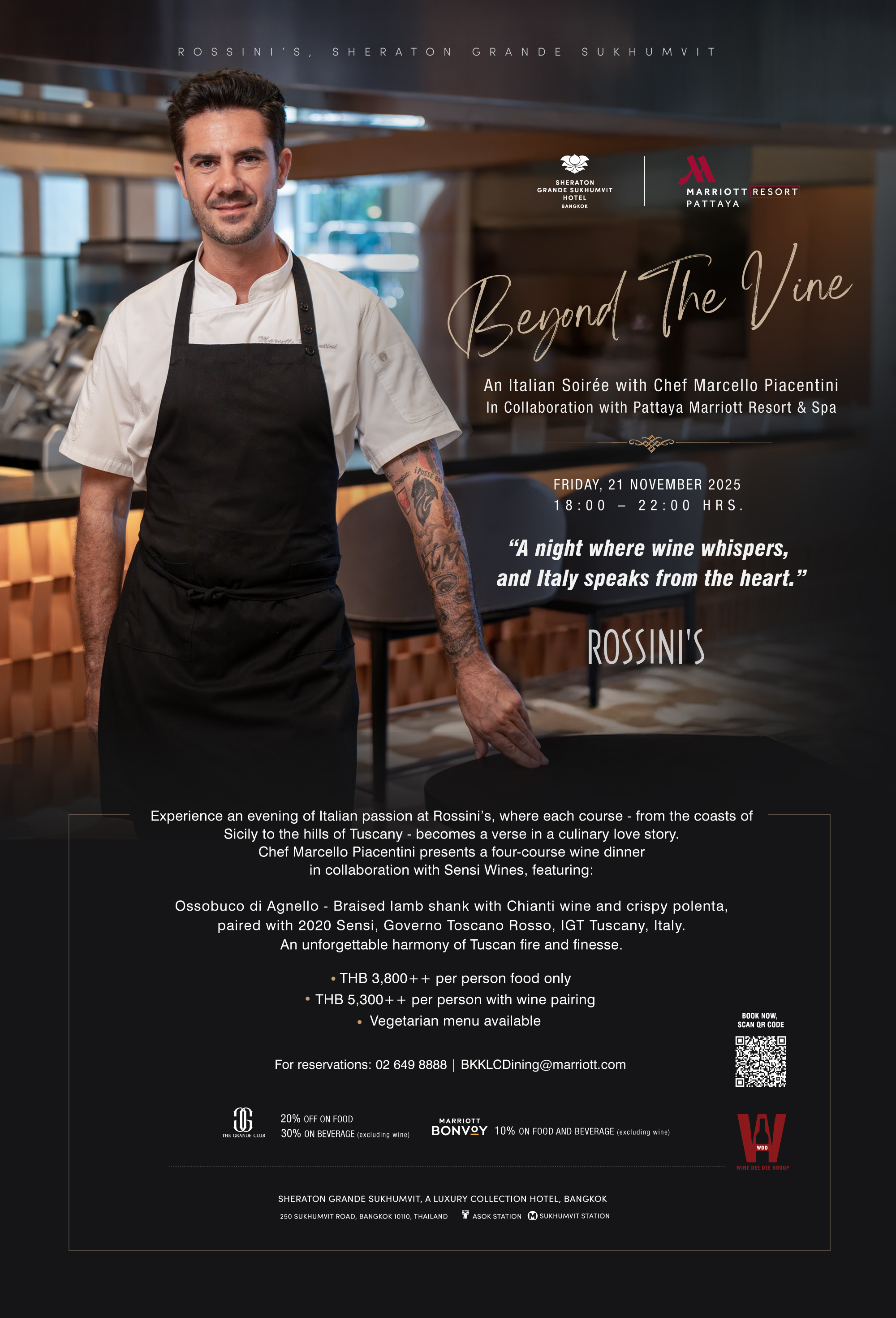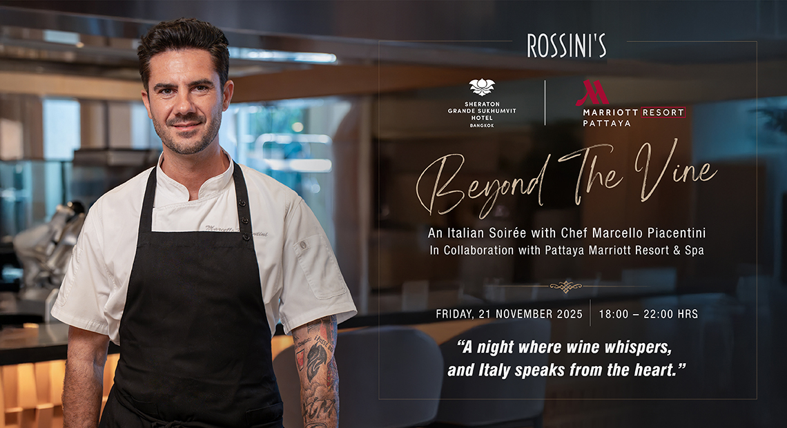 In collaboration with Chef Marcello Piacentini from Pattaya Marriott Resort & Spa, this one-night-only wine dinner unveils a sensory journey across Italy — from the hills of Tuscany to the coastlines of Sicily.