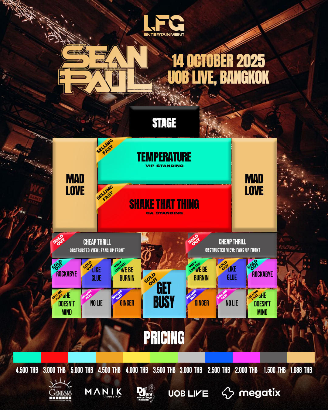 หลายคนโตมากับจังหวะเพลงของเขา...ถึงเวลามาแดนซ์สด ๆ ครั้งแรกในไทยกับ SEAN PAUL ตัวจริงเสียงจริง 14 ตุลาคม 2025 ที UOB Live ลงทะเบียนล่วงหน้ากับ LFG Nation วันที่ 25 สิงหาคม เพื่อ สิทธิ์ซื้อบัตร Pre-sale ก่อนใคร พร้อมสิทธิพิเศษเอ็กซ์คลูซีฟอีกเพียบ ห้ามพลาด! ตั้งแต่ “Temperature”, “Get Busy” จนถึง “No Lie” บทเพลงฮิตระดับโลกจะถูกนำมาสร้างความสนุกสุดมันส์บนเวทีตลอดทั้งคืน
