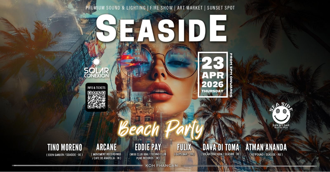 Thursday, April 23rd, the SEASIDE BEACH PARTY returns to the best beach spot in Haadrin, Koh Phangan, with an exceptional lineup! 🥳👌