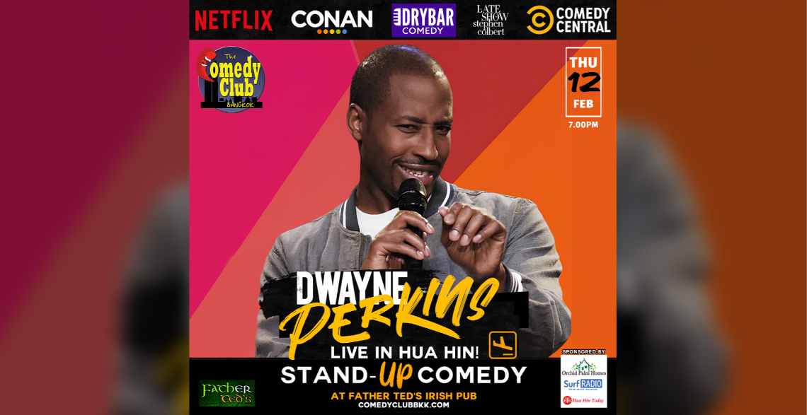 A favourite with Hua Hin audiences, Brooklyn native DWAYNE PERKINS is back!Β With a long list of TV credits, Dwayne is a standout voice in modern stand-up and is best known for his acclaimed NETFLIX one-hour special DWAYNE PERKINS: TAKE NOTE, which debuted to rave reviews and quickly became a fan and critic favourite.