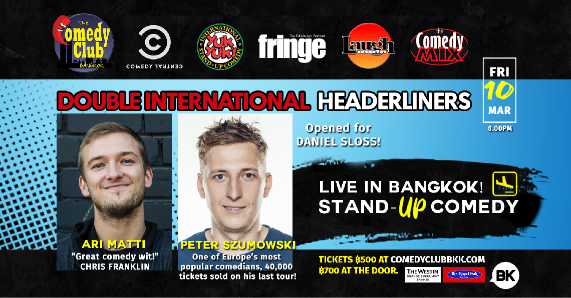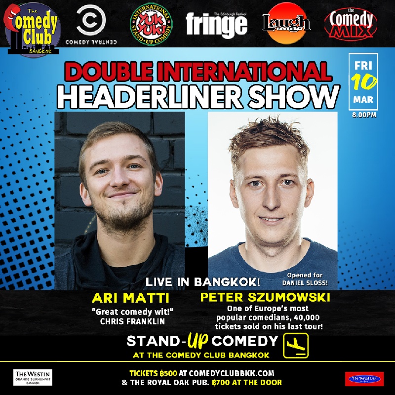 Get ready for two of the finest European comedians flying into Bangkok to deliver comedy with a slightly different approach in this new and unique stand-up comedy show! First up is PETER SZUMOWSKI, supremely well known in Poland with over 40,000 tickets sold on his last tour and as seen on COMEDY CENTRAL, he delivers a soft, yet witty approach to how it is being Polish and growing up in the UK. Next up is the Estonian monster himself, ARI MATTI, who has delighted and shocked audiences into fits of laughter all over the world from the UK at the EDINBURGH FRINGE to Canada's best known comedy club YUK YUKS. Each comedian are a headliner in their own right, but for this show you get TWO international pros for the price of ONE.