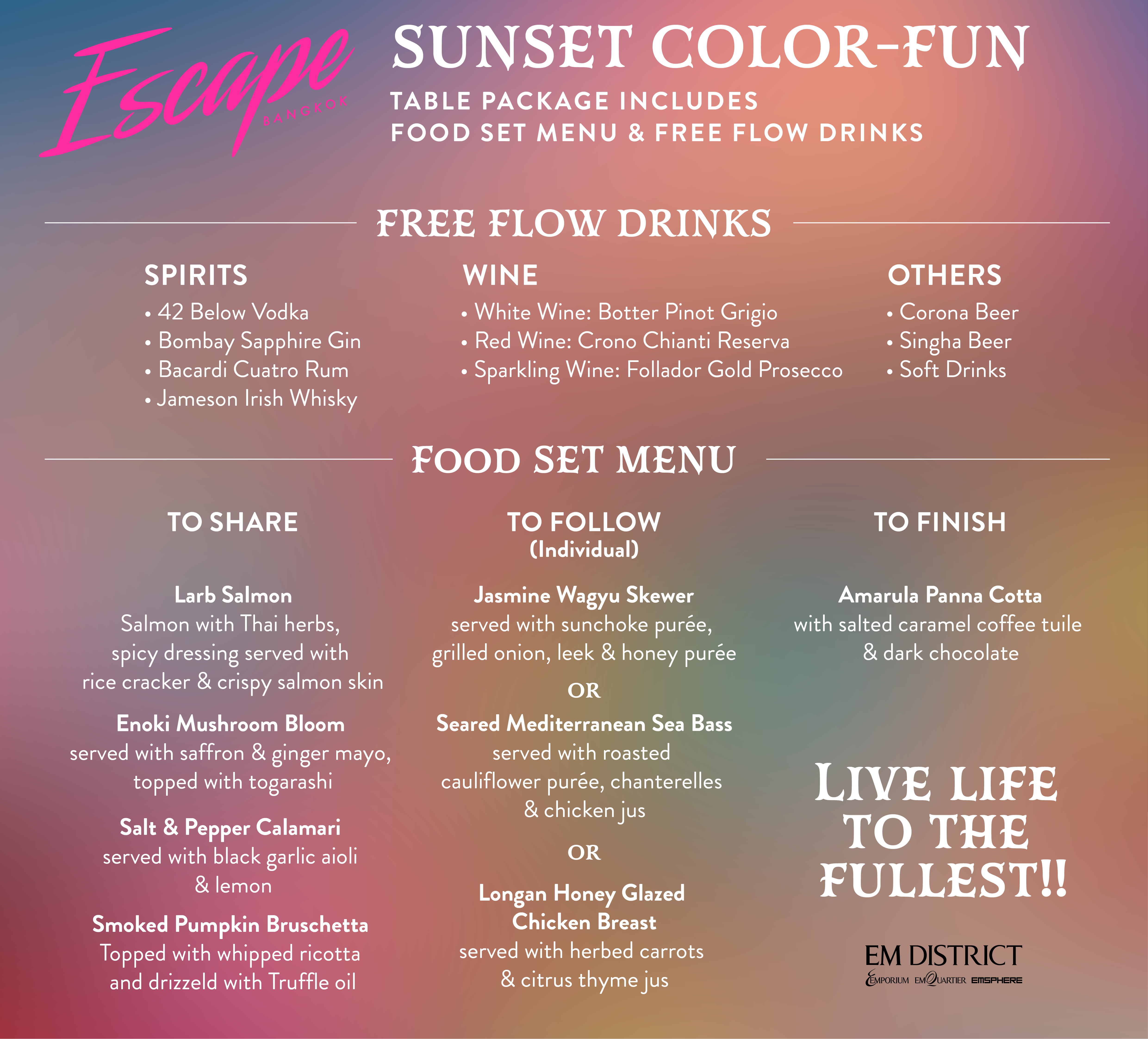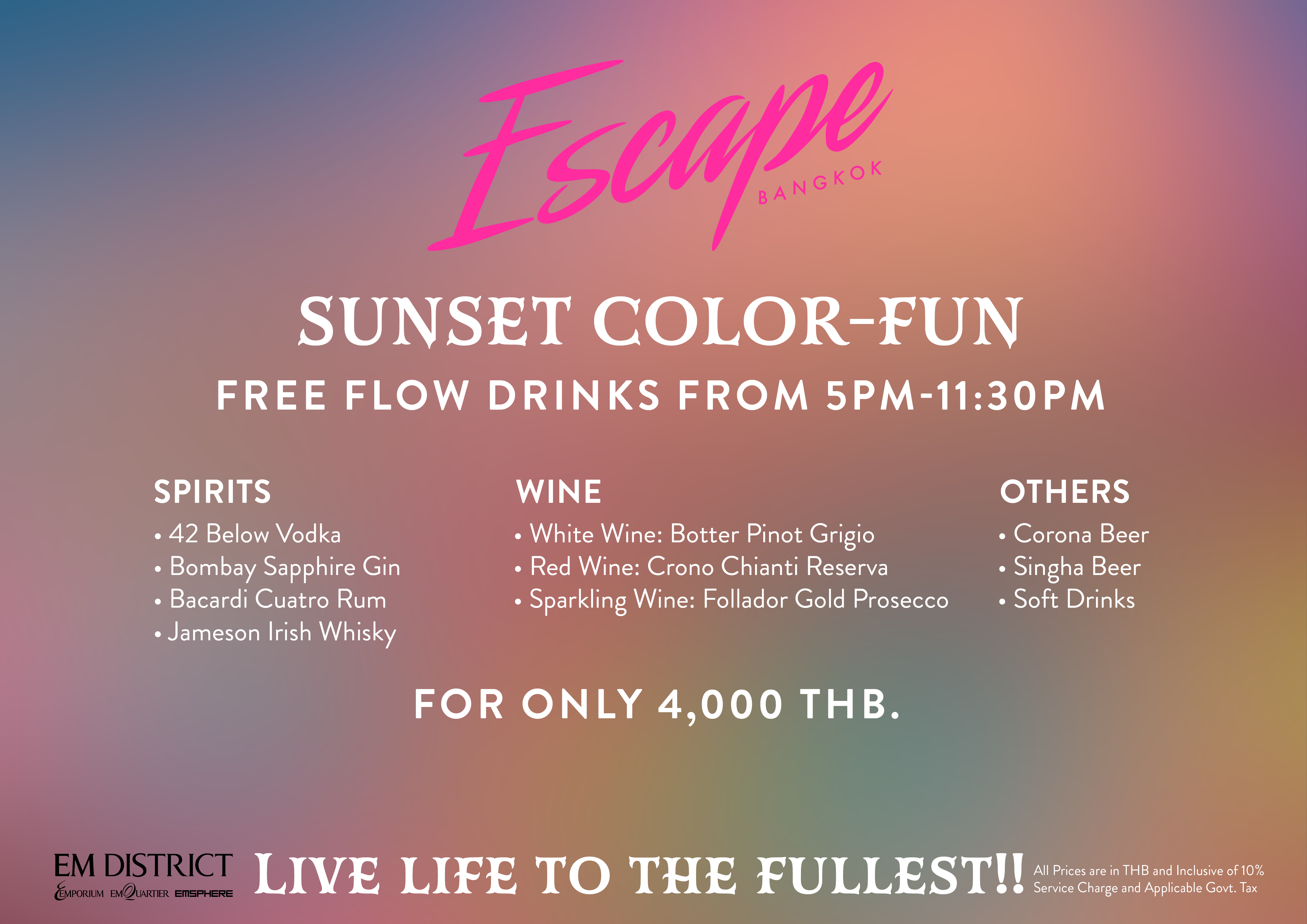 Celebrate the last sunset of the year above Bangkok’s skyline as Escape Bangkok Rooftop Bar transforms into a radiant playground of color, music, and pure celebration. Glow into 2026 with neon accents, vibrant cocktails, upbeat beats, and a high-energy atmosphere unlike anywhere else in the city.