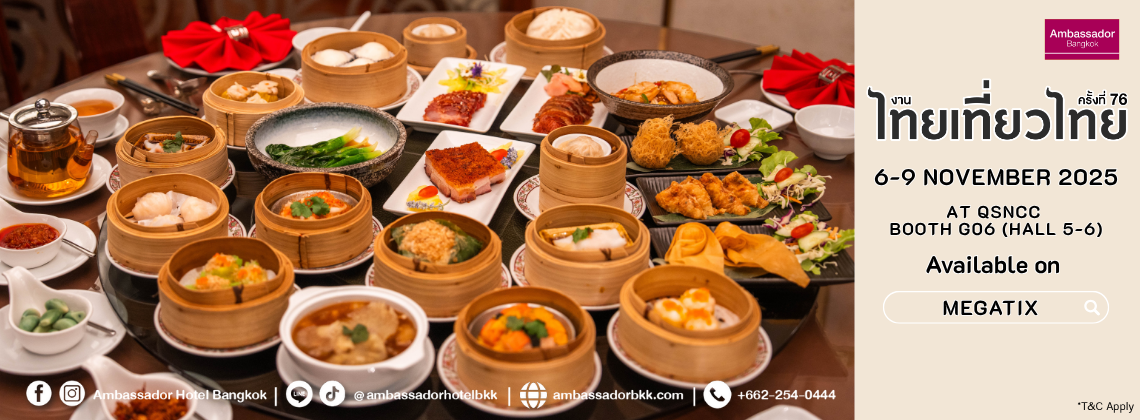 ร่วมสัมผัสเสน่ห์แห่งวัฒนธรรมไทยใจกลางกรุงเทพฯ ในบรรยากาศสุดหรูของโรงแรมแอมบาสซาเดอร์ กรุงเทพฯ กับงานไทยเที่ยวไทยที่ทุกคนรอคอย พร้อมโปรโมชั่นสุดพิเศษเฉพาะบน Megatix เท่านั้น!
