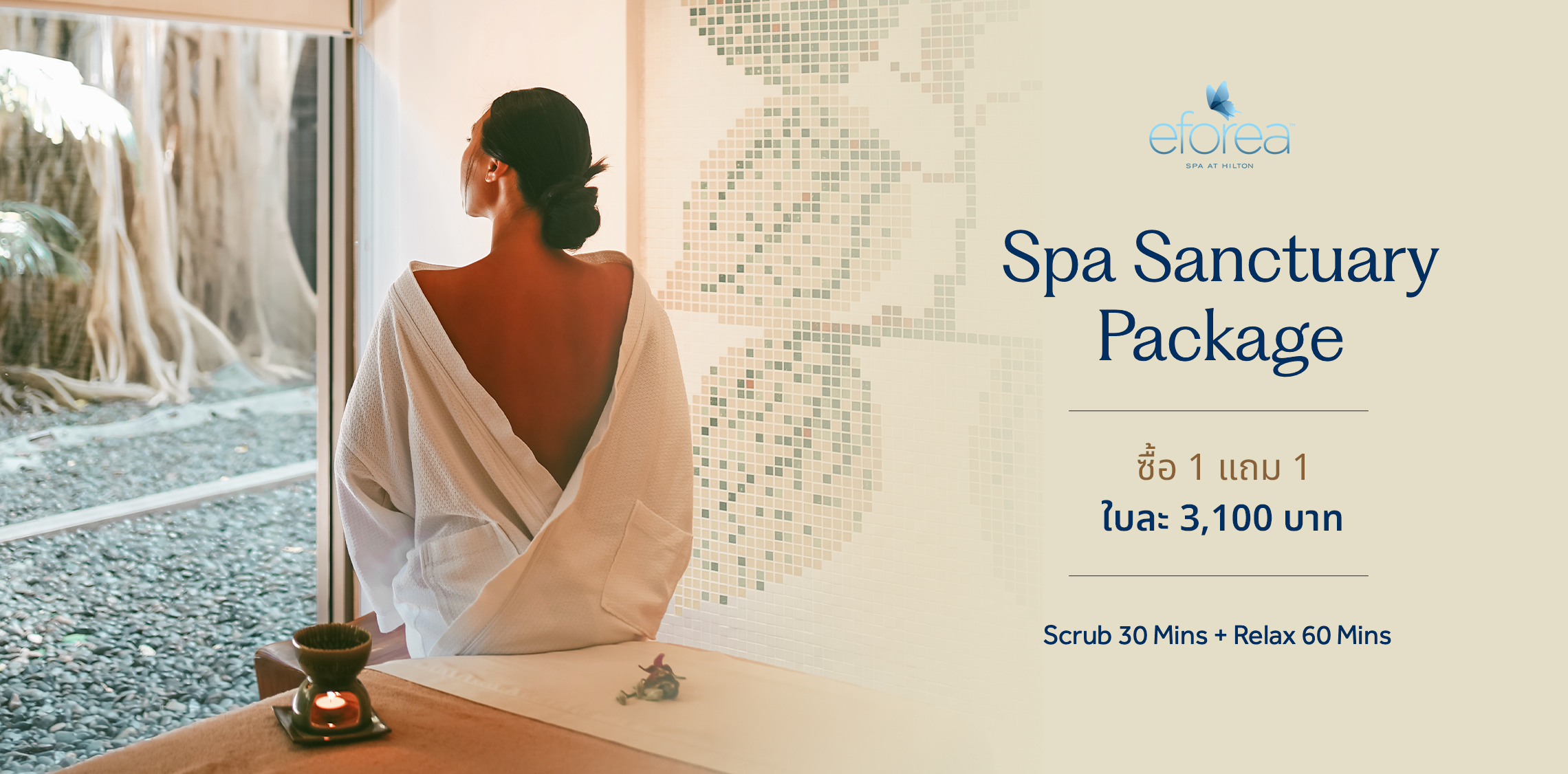 - Spa Sanctuary Package (Scrub 30 mins + Relax 60 mins) ใบละ 3,100 บาทสุทธิ | ซื้อ 1 แถม 1
