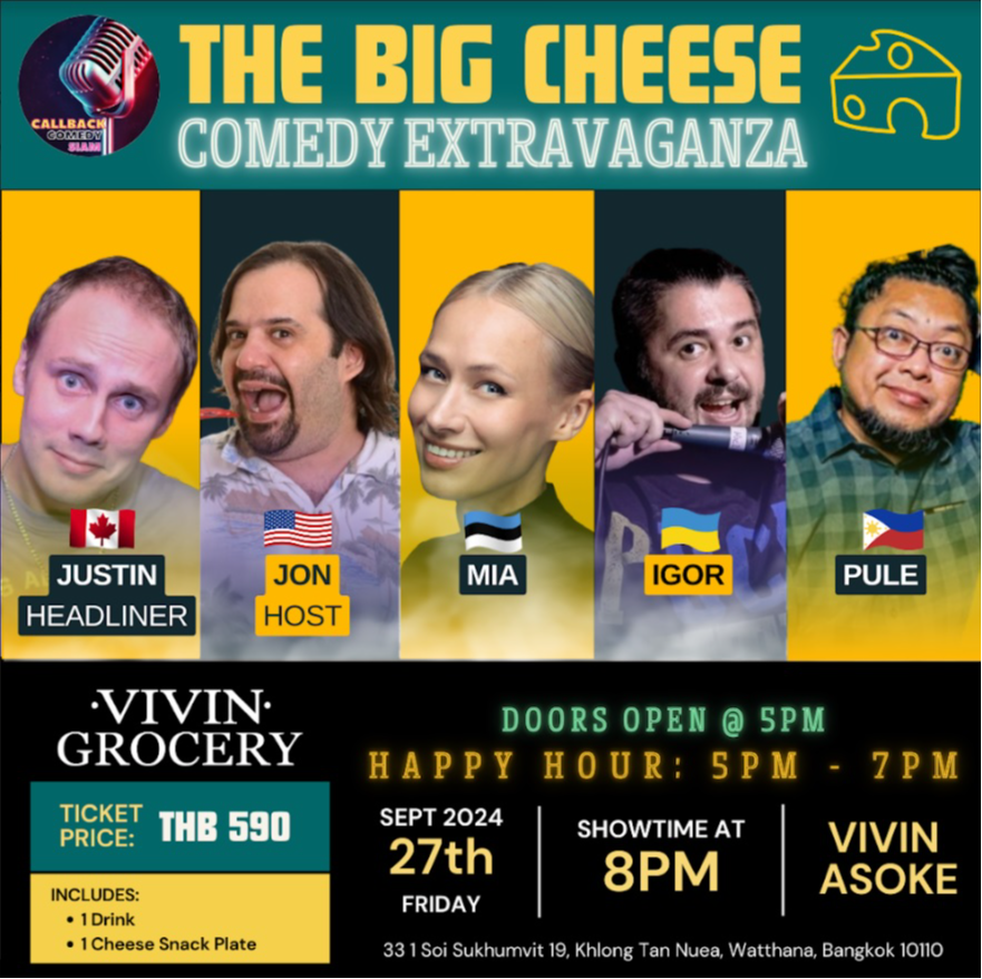 Comedy is back in VIVIN! But it's in Asoke! Callback Comedy Siam and VIVIN Asoke present The Big Cheese Extravaganza!, Friday, September 27, 2024. Canadian powerhouse and local favorite Justin St. Denis headlines to satisfy your hunger for laughter on a Friday night. Jon Samson hosts a select crew of comedians that will bring side splitting laughters the entire show.