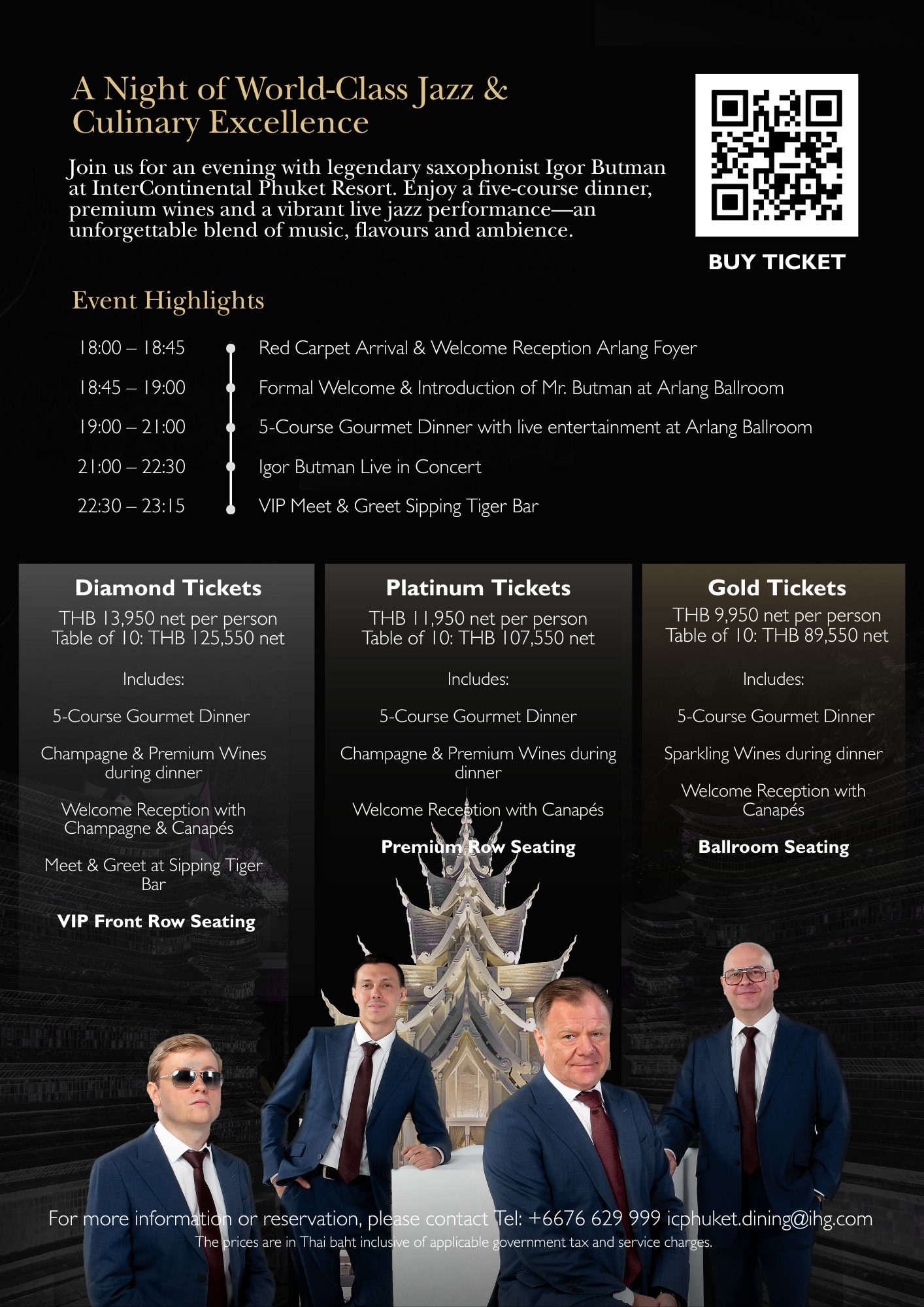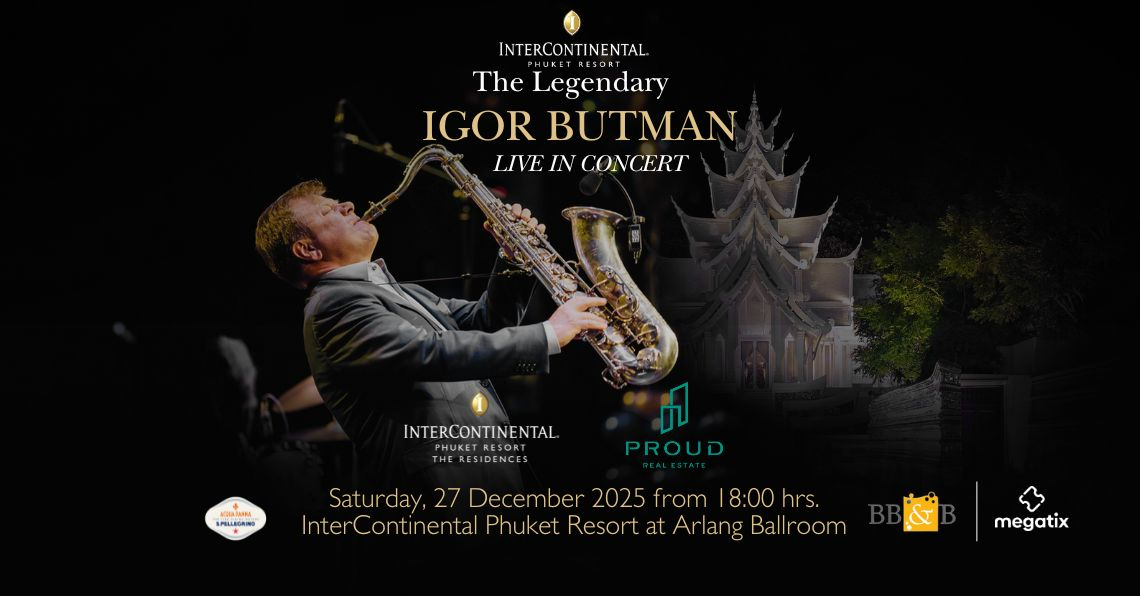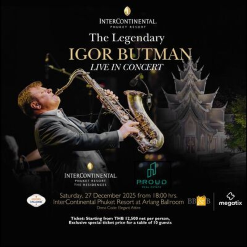 Join us for an evening with legendary saxophonist Igor Butman at InterContinental Phuket Resort. Enjoy a five-course dinner, premium wines and a vibrant live jazz performance—an unforgettable blend of music, flavours and ambience.