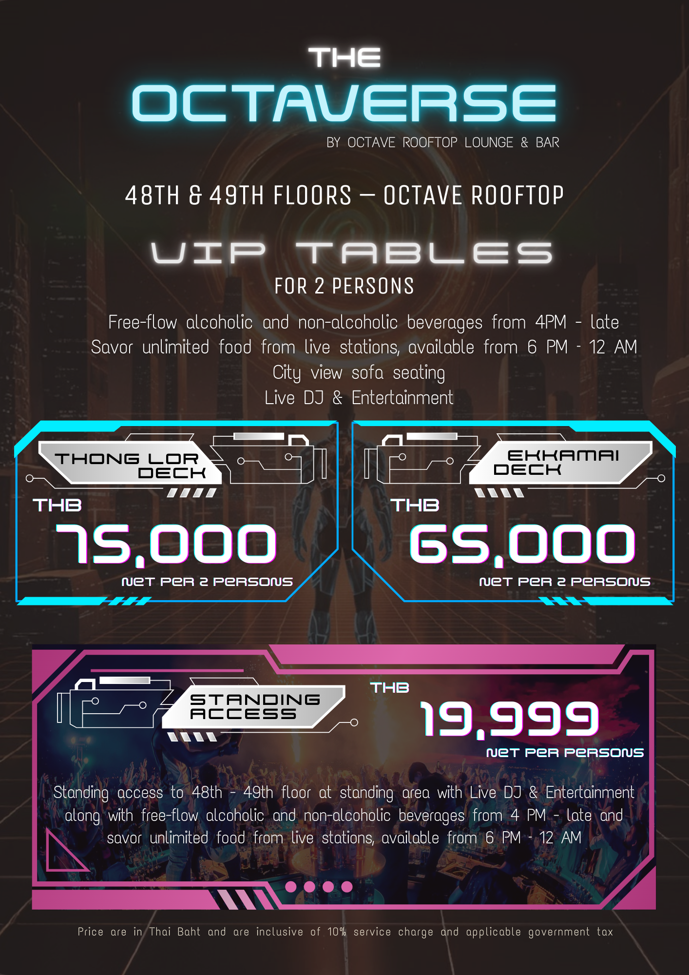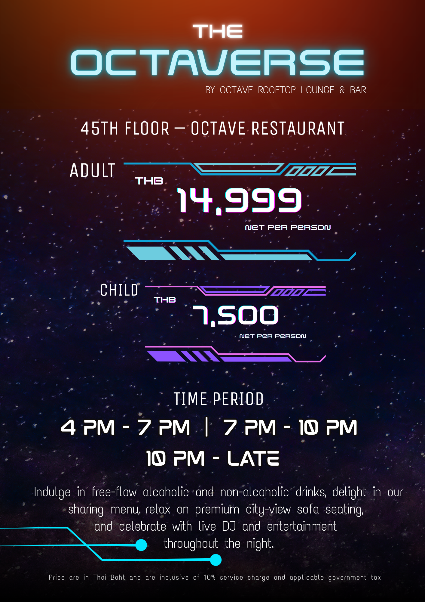 - Age Restriction: This event is exclusively for guests aged 20 years and above on the 47th, 48th, and 49th floors. Guests of all ages are welcome to the celebration on the 45th floor.