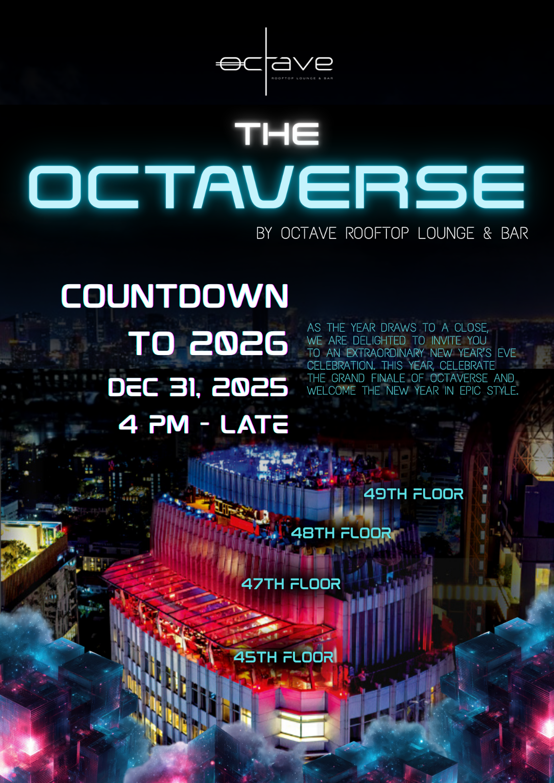 Ring in 2026 at Octave Rooftop Lounge & Bar, transformed into the ultimate Octaverse for one unforgettable night.
