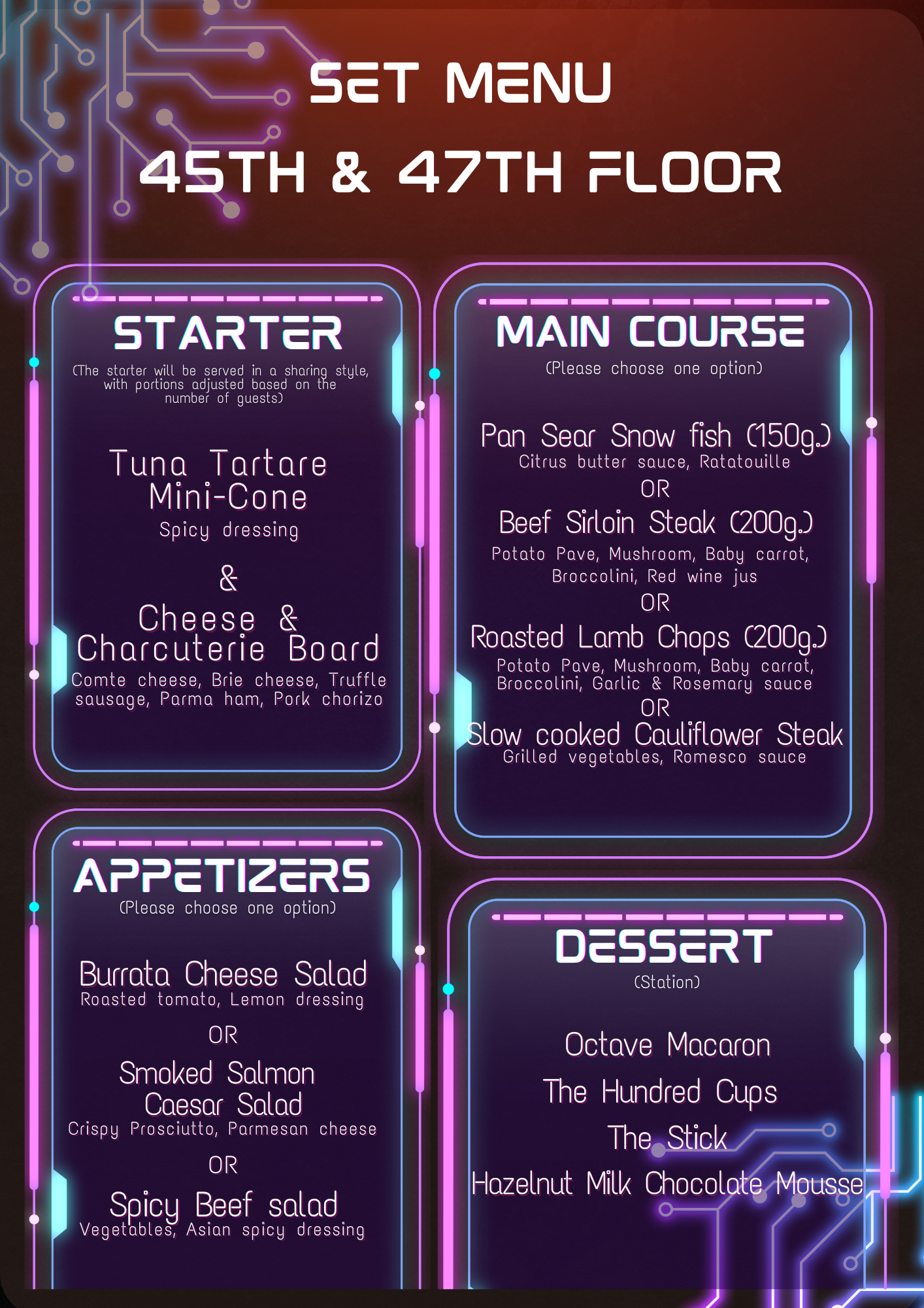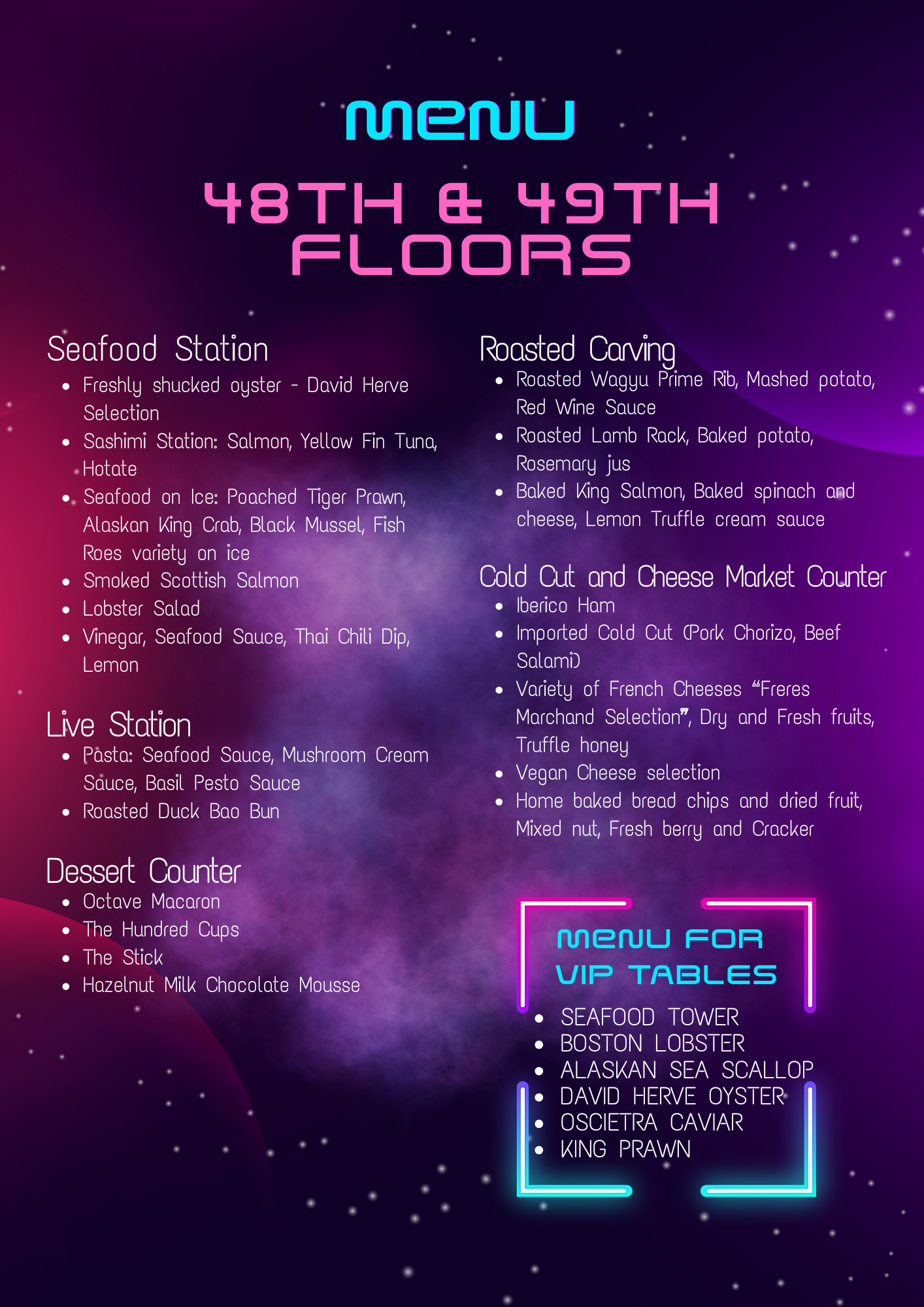 - Age Restriction: This event is exclusively for guests aged 20 years and above on the 47th, 48th, and 49th floors. Guests of all ages are welcome to the celebration on the 45th floor.