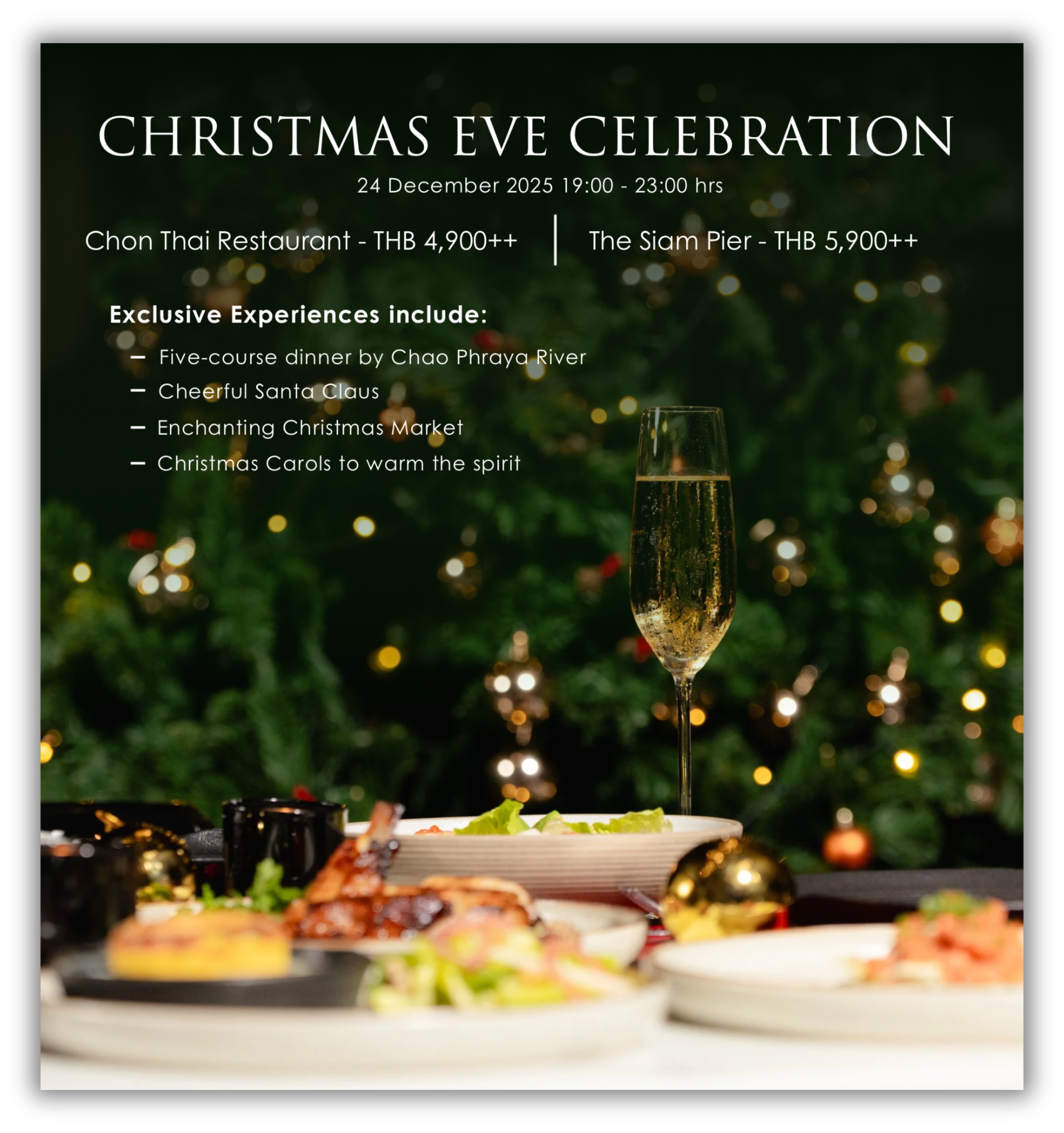 Celebrate the magic of Christmas at The Siam. Join us for an enchanting evening filled with festive delights, including a five-course dinner by Chao Phraya River, the cheerful presence of Santa Claus, and a charming Christmas Market to spark the holiday spirit. Enjoy heartwarming Christmas carols as you create unforgettable memories with your loved ones.