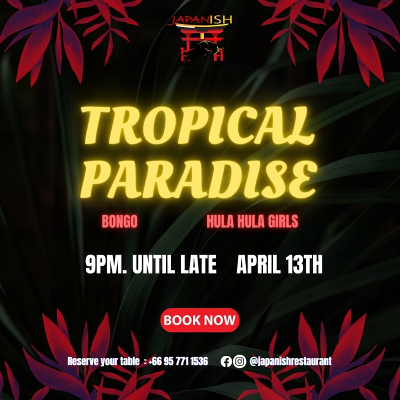 Get ready to escape to an island oasis on April 13th at Japanish! Join us for an unforgettable Tropical Night filled with exotic vibes and electrifying entertainment.