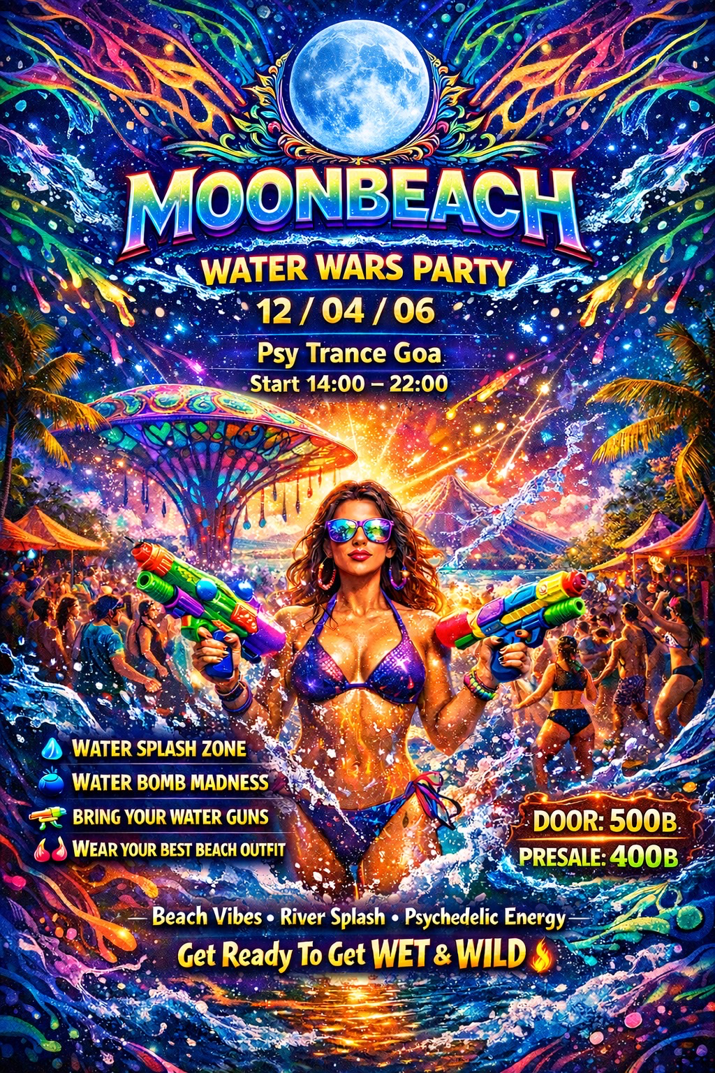 Dive into a psychedelic splash of music, color, and pure beachside madness! Get ready to dance under the full moon as electrifying Psy Trance Goa beats ignite the atmosphere and waves of water fuel the fun.